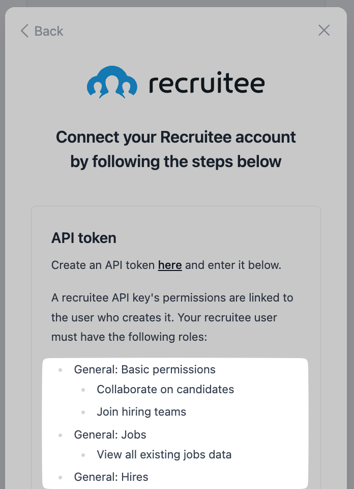 If you are the administrator of your Recruitee account and want to enable another user to set up the integration, you will have to update the permissions of the user's hiring role to match the expected permissions mentioned in the connection flow.