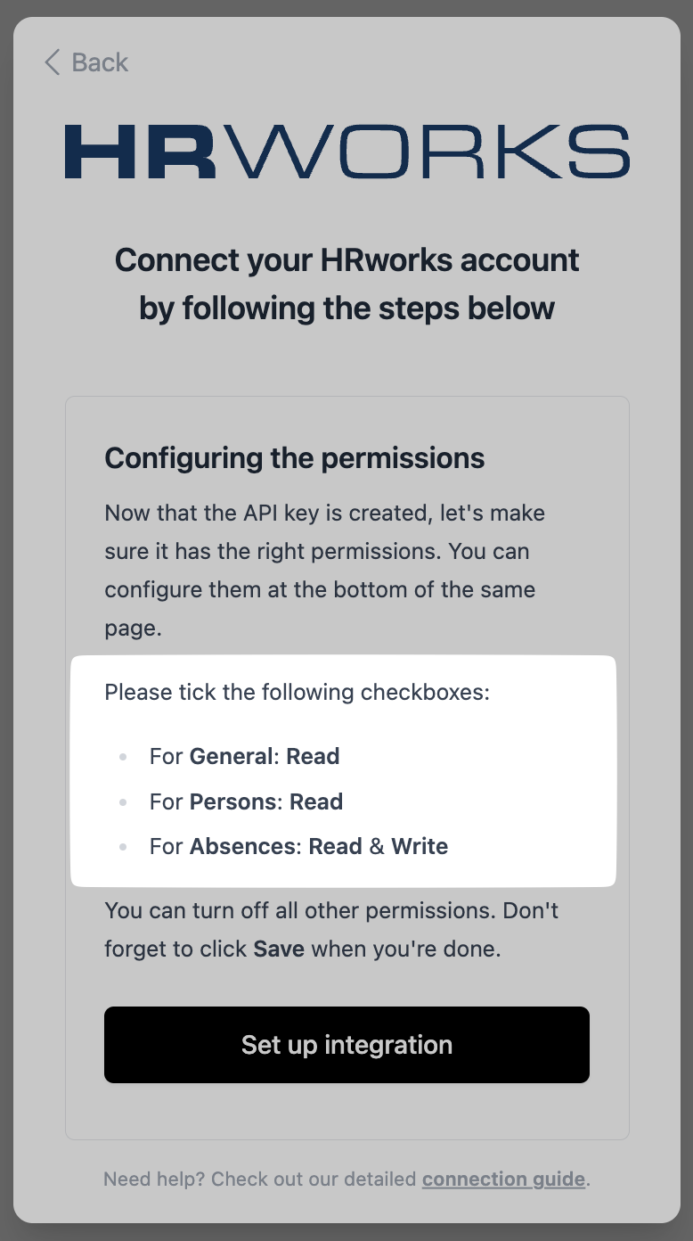 Now, in HRworks, select the key you just generated and check the required permissions at the bottom of the page, and press save