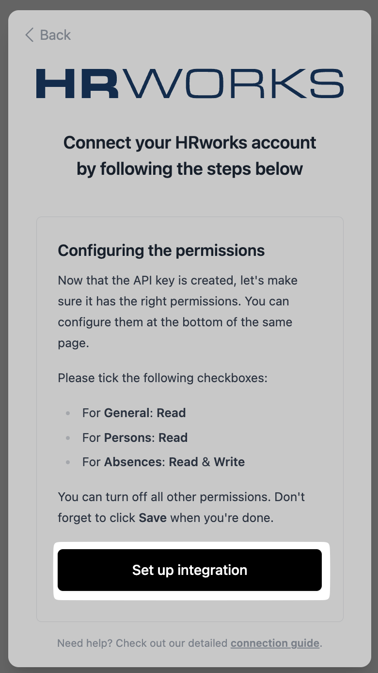 This is just an example, your required scopes might look different! - Finally, click "Set up integration" in the connection flow