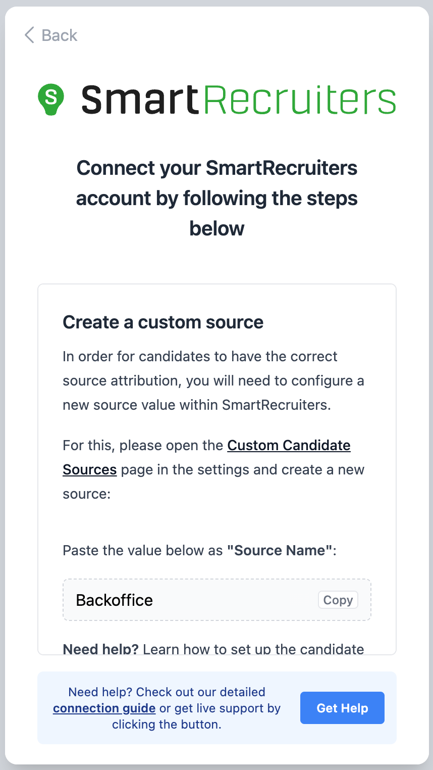 If required be your partner, you will be prompted to create a source within the SmartRecruiters system.