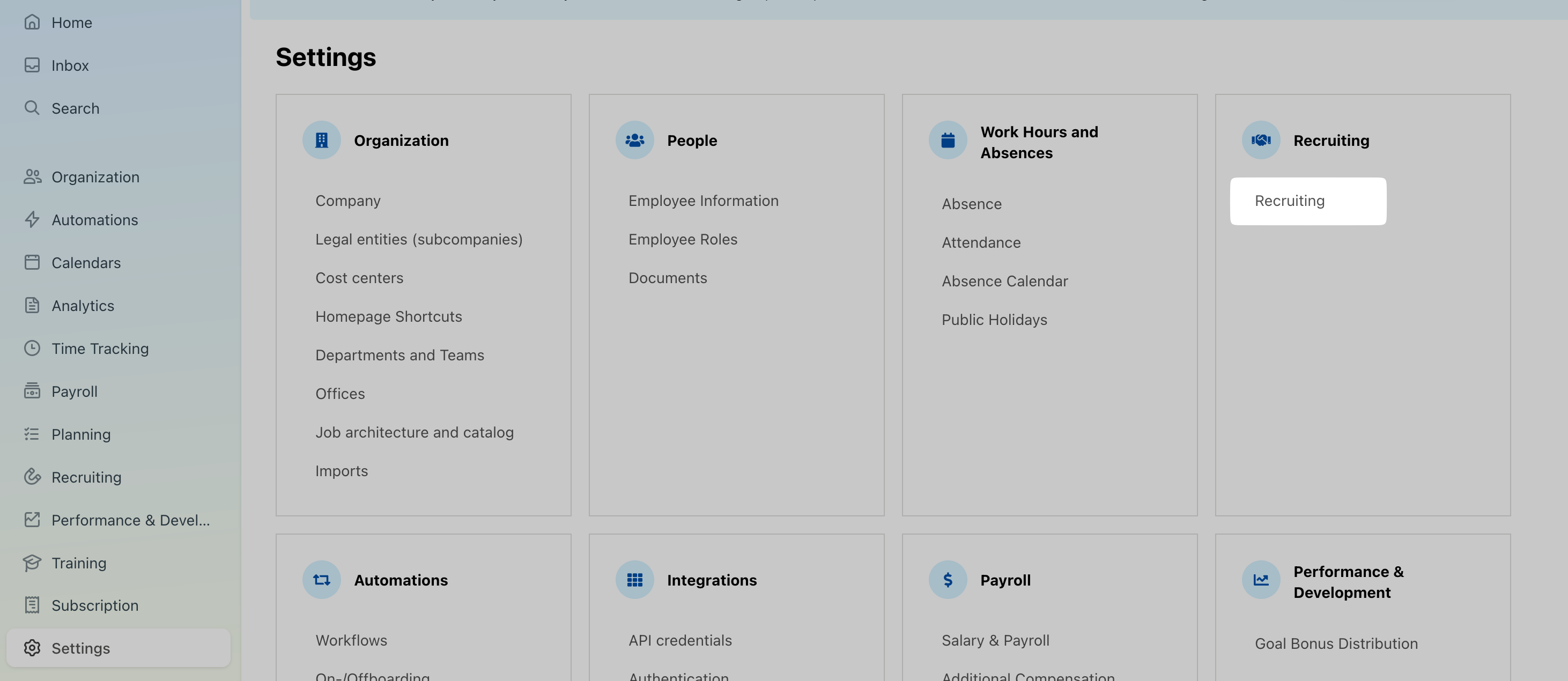 - From the settings page select “Recruiting” from the “Recruiting” section: