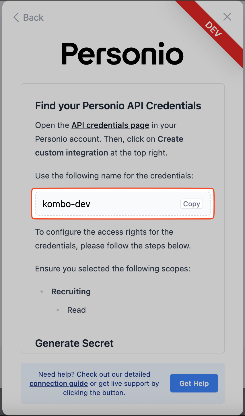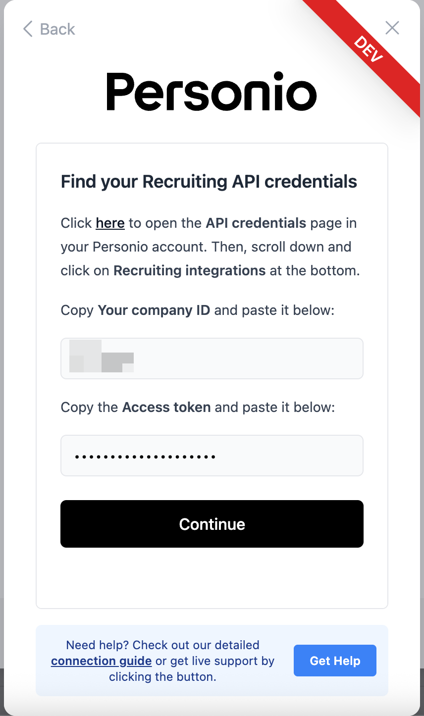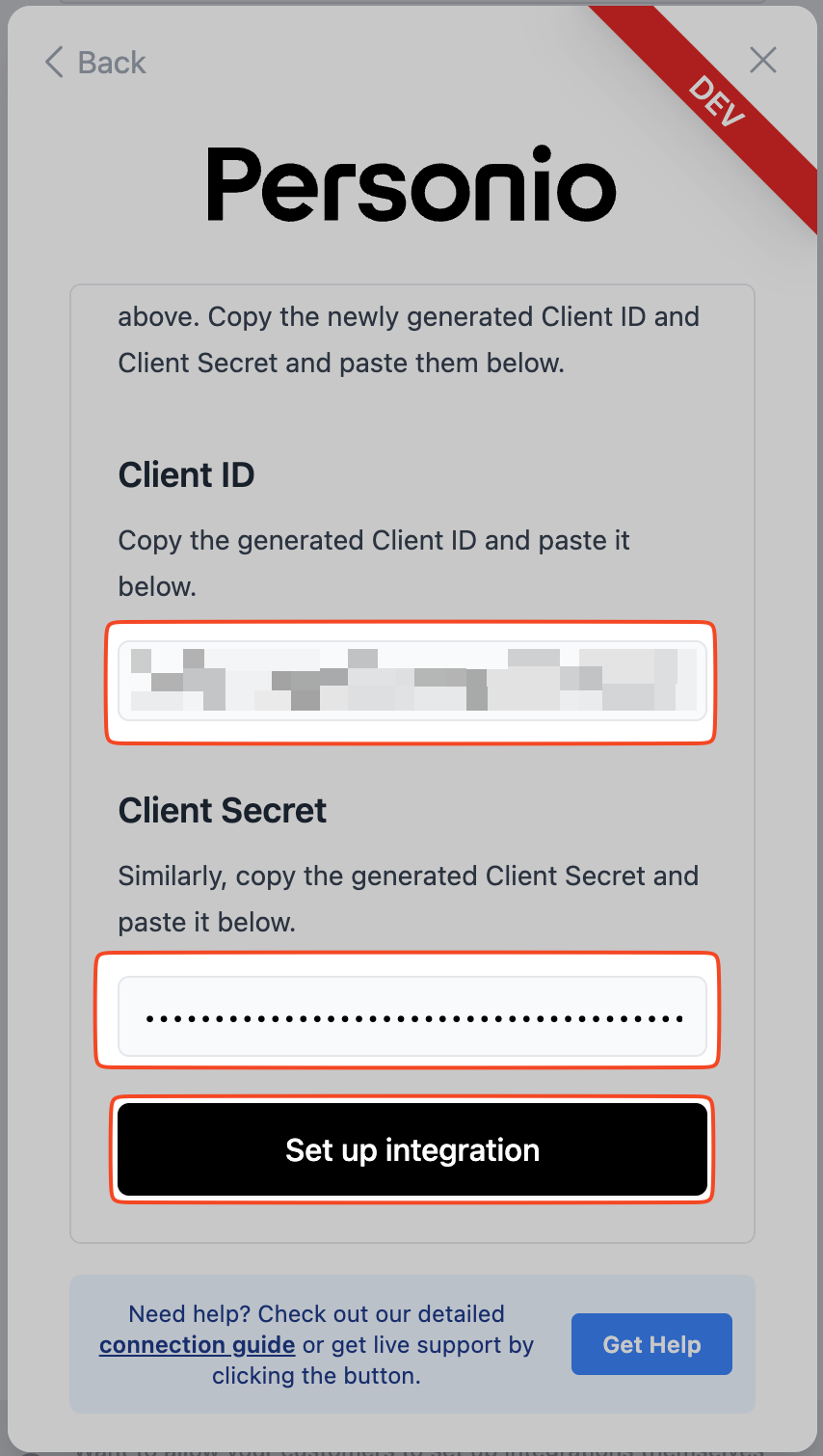 - Copy the "client ID" and "API Secret" from Personio, and paste them into the connection flow, and click on "Set up integration" in the connection flow: