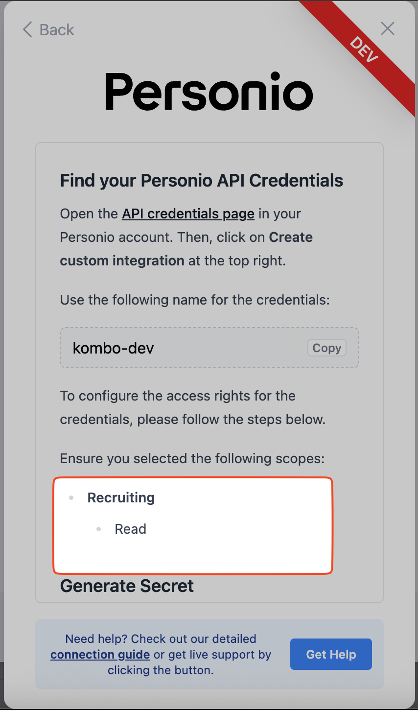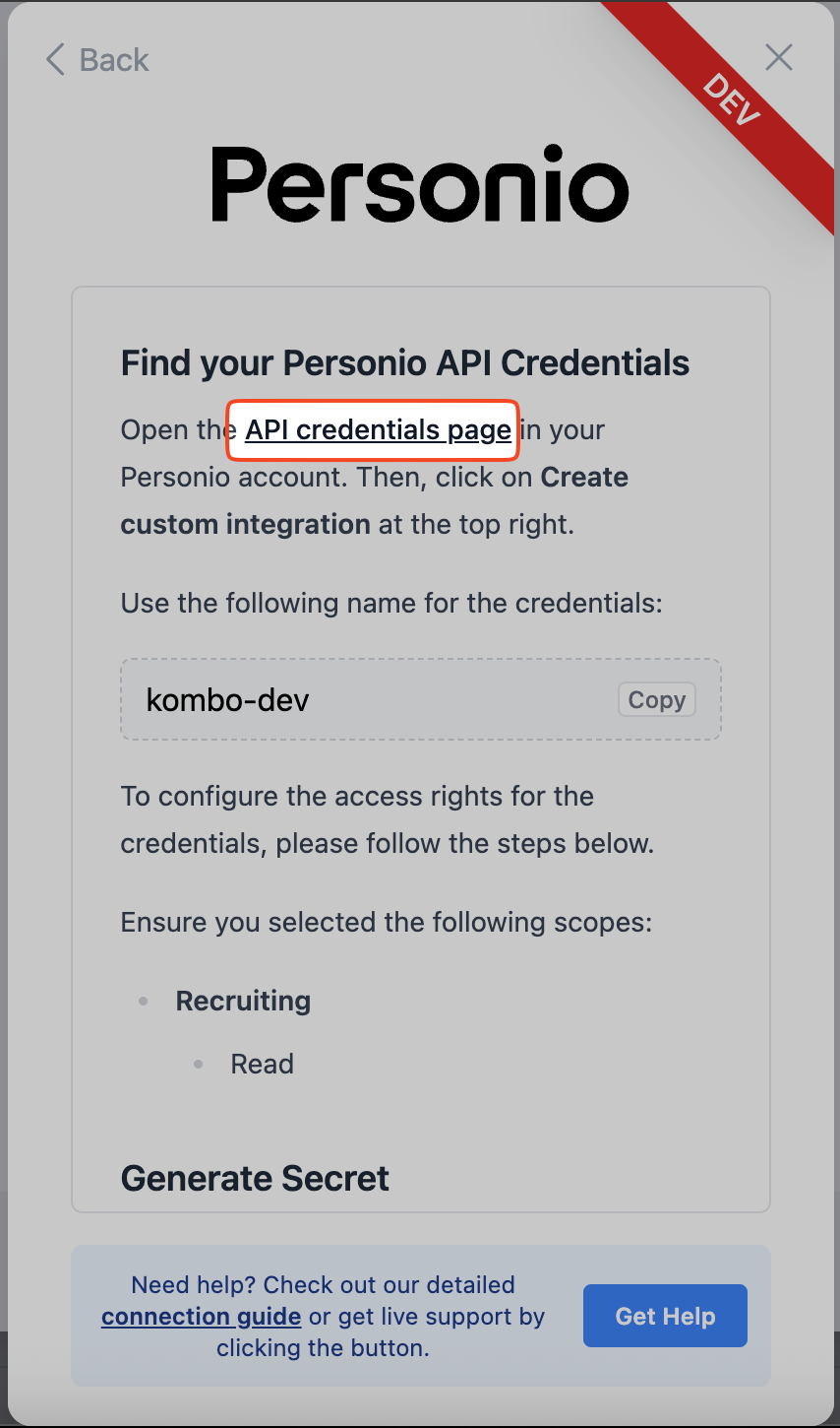 - Personio provides system-generated credentials for ATS APIs, we don’t need to generate new credentials. So, in the “API credentials” page the credentials should already be listed in the bottom as “Recruiting API key”.
