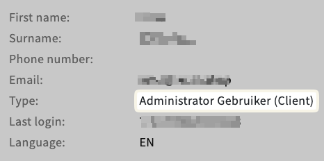 3. Navigate to the "PROFILE" section of the "USER PROFILE" page, and make sure that your account has the "Administrator" type. If you are not an administrator, find out who is the "Administrator" in your company's Nmbrs instance, and ask them to assign your account the "Administrator" type or to take over the setup process: - In general, this guide is written for Nmbrs Business tenants (unless you are part of an accountancy firm, you will have a Business tenant). If you have an Nmbrs Accountant tenant, the guide should still work, however, if you only want give access to the data of a particular client, you may need to log in into the Business sub-tenant of your client with an admin account.