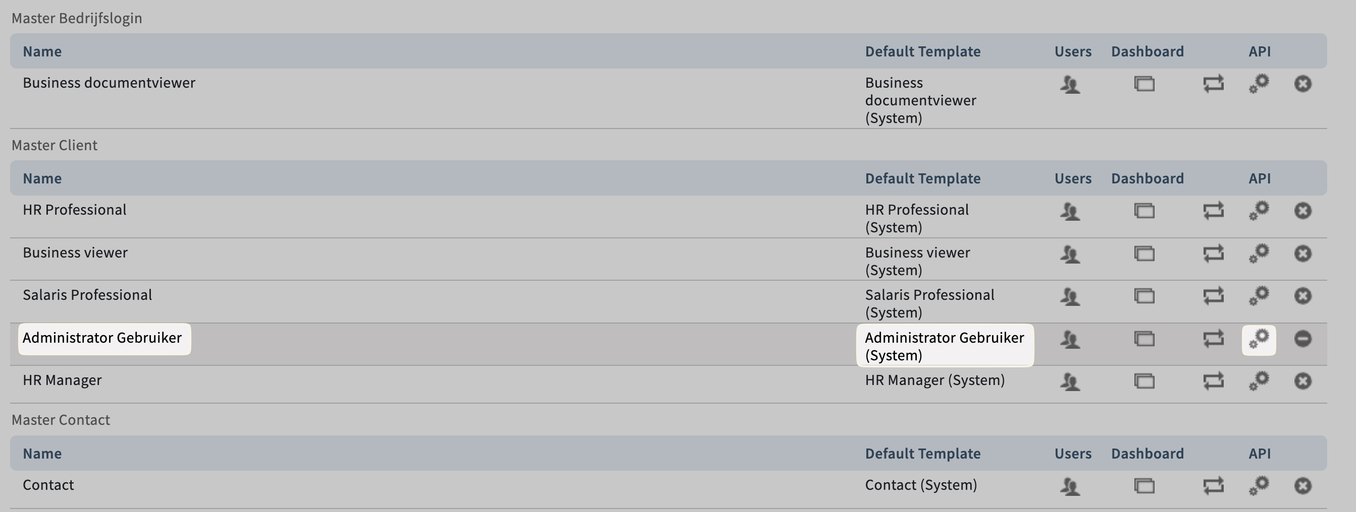 - Scroll down until you see the User type of your user that you noted down earlier (it should be in the 'Master Client' section). In this example, the User type was "Administrator Gebruiker", so we are looking for this name. After you have found it, click on the respective cog in the "API" column:
