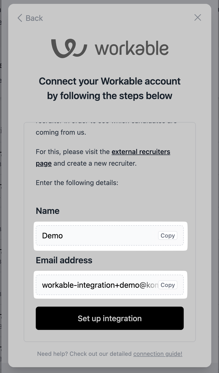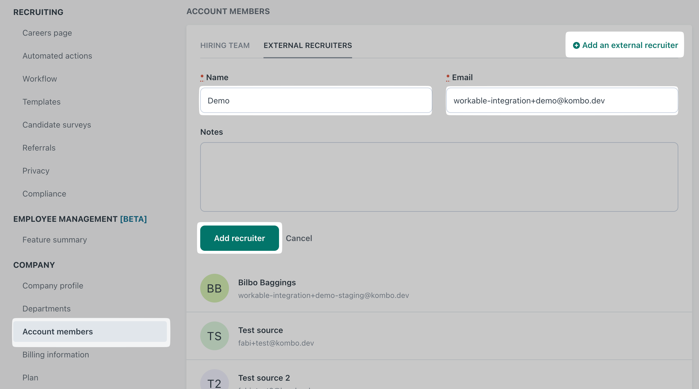 3. Important: Copy and paste the previously provided values into the name and email. Then click on "Add Recruiter". Your source is now set up.
