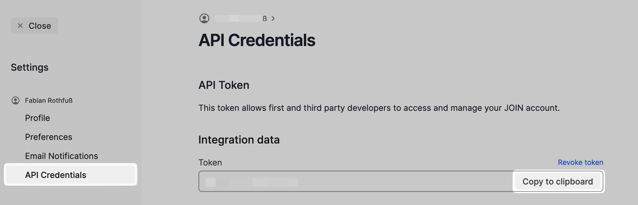 - Log into Join and click on your profile circle in the bottom left, then on "User settings":