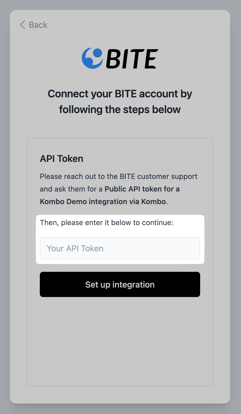 - To get started, it's necessary to contact BITE's customer support and ask specifically for a "BITE Public API token for an integration via Kombo." This will tell BITE customer support to set up an API token with the right access permissions for you.