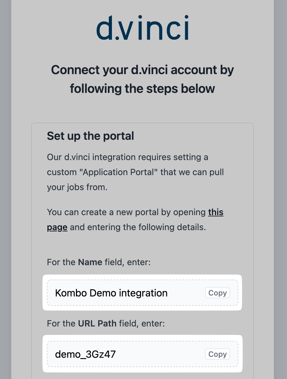 - Copy and paste both of these into the right fields in d.vinci: