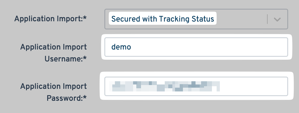 Select Secured with Tracking Status, and enter the corresponding Application Import Username, and Application Import Password