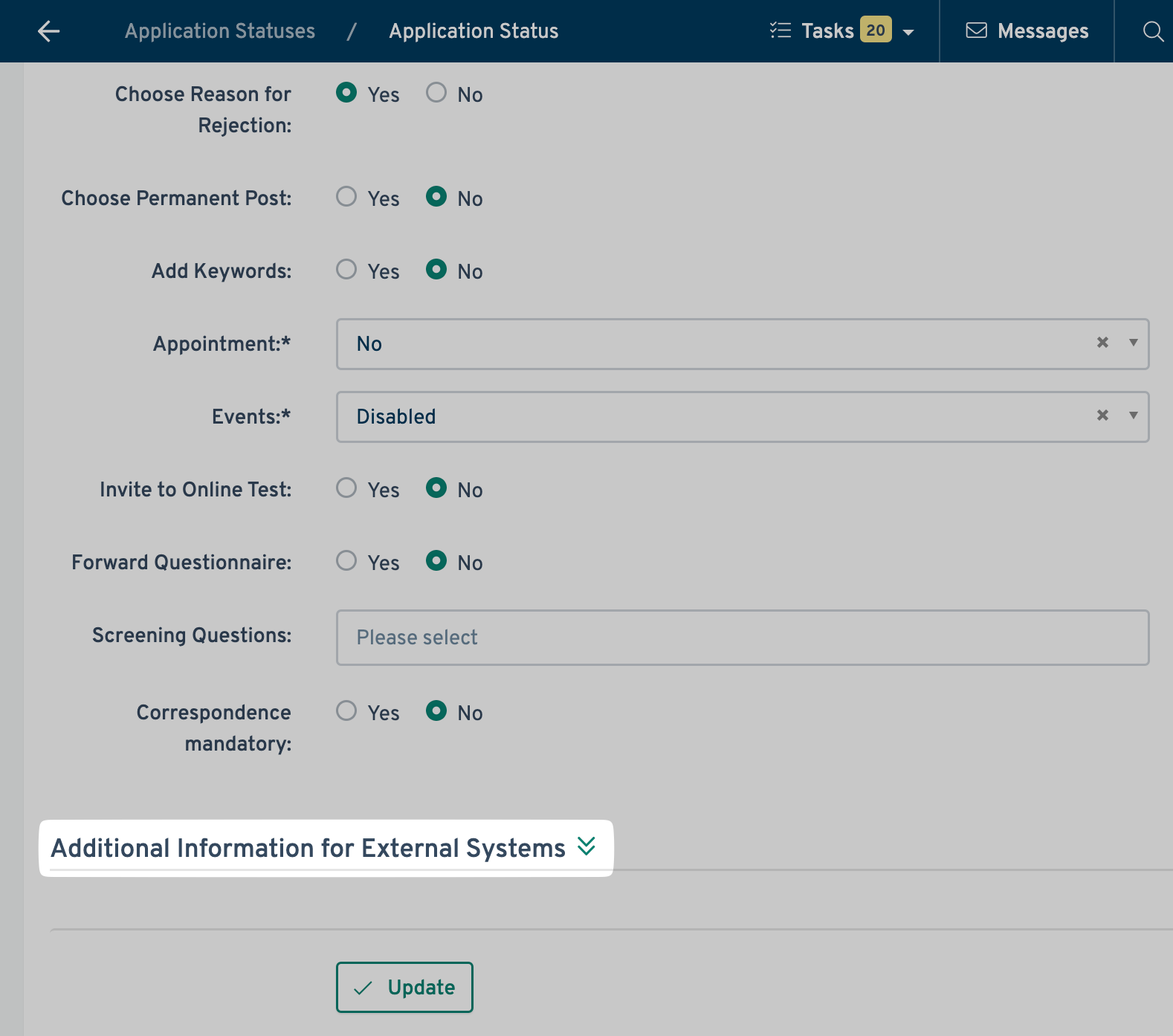 - For the Tracking Status, enter either K_REJECTED or K_HIRED depending on the status