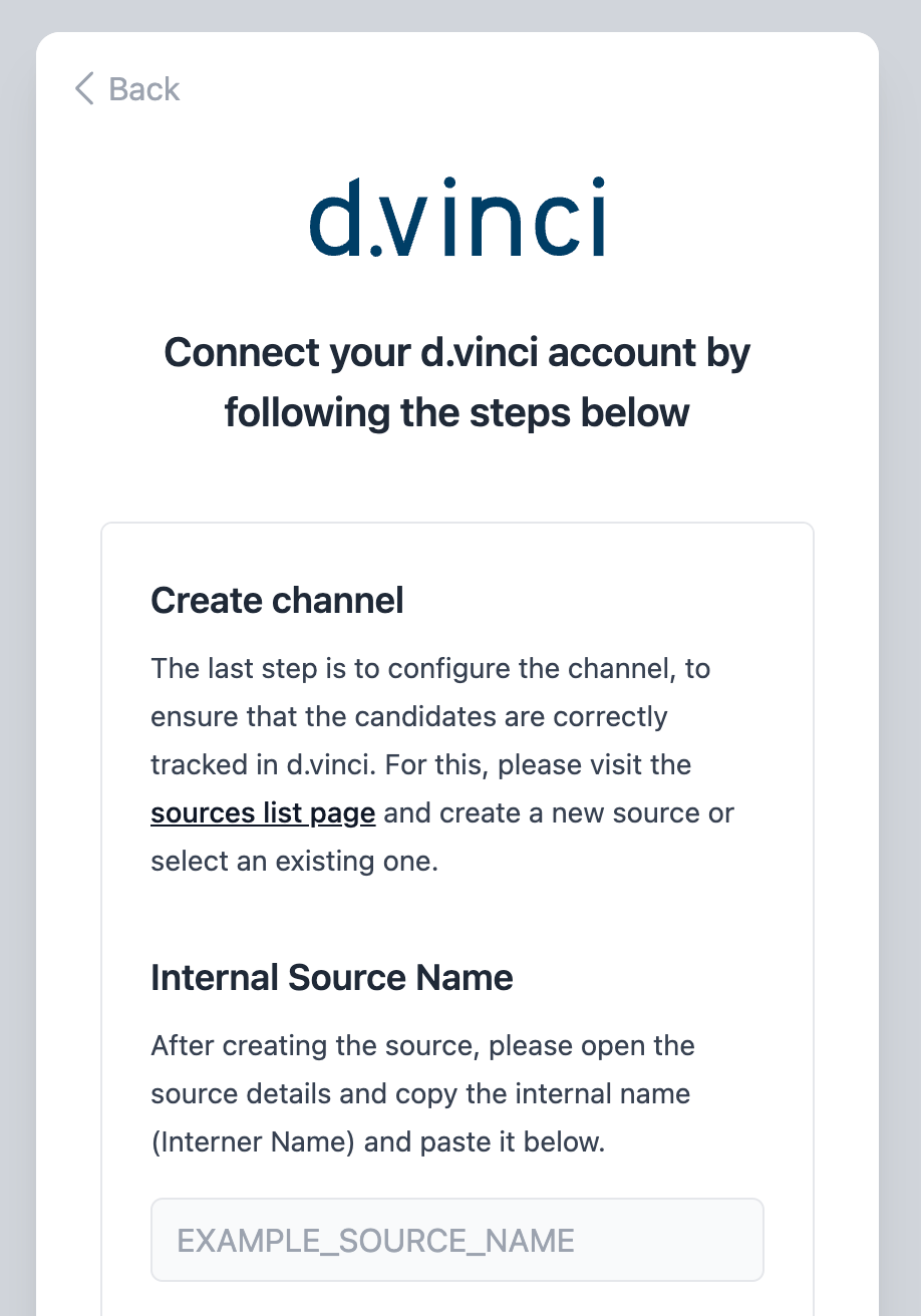 If mandatory for this integration, you'll need to configure a source in d.vinci to see where new applications are coming from. In that case, you will see a screen like this
