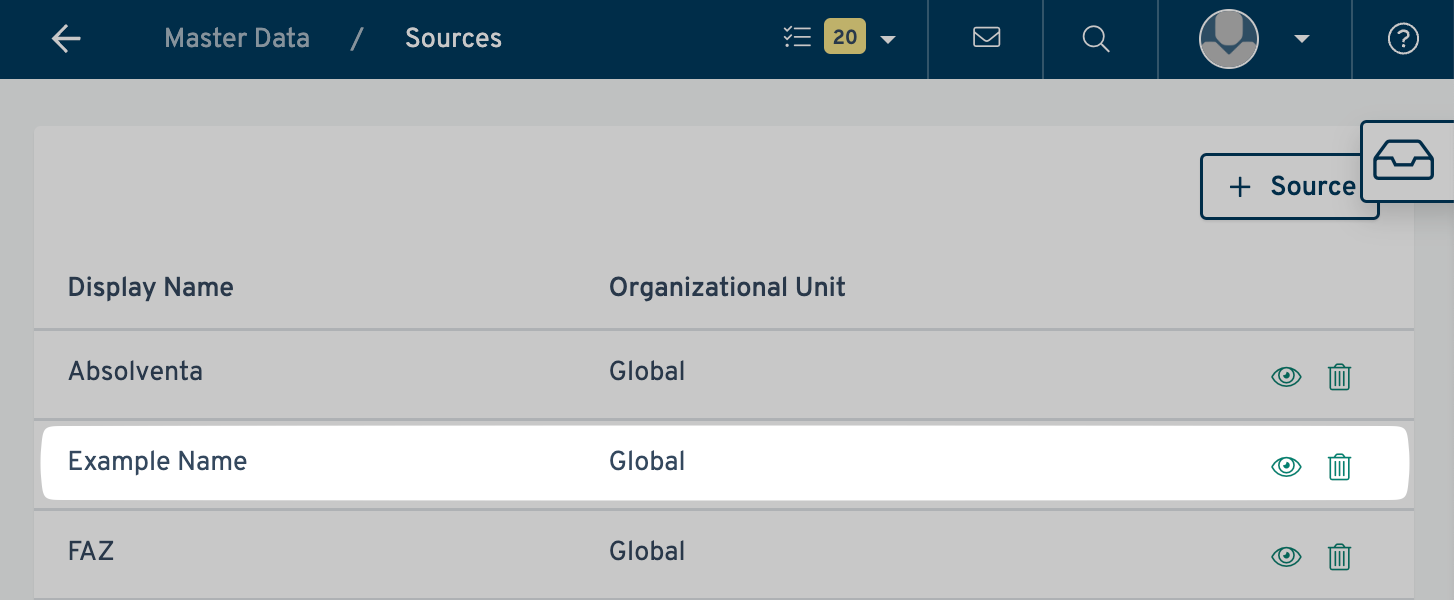 - Click on Sources. On the sources page, click on the + Source button in the top right corner: