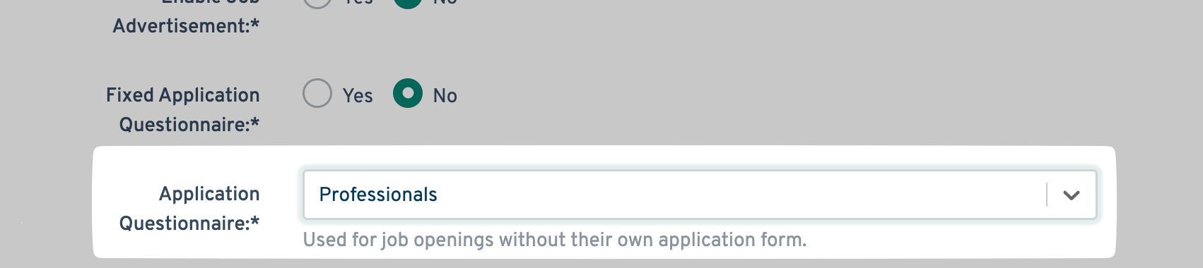 - Select a default Application Questionnaire for your jobs