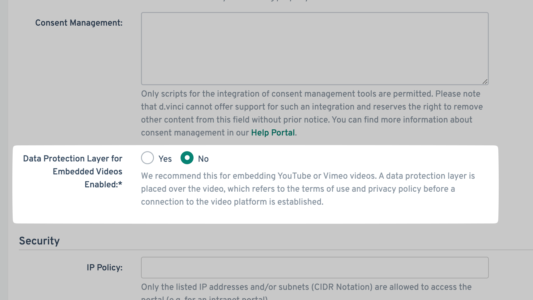 - Scroll down until Data Protection Layer for Embedded Videos Enabled, and select No