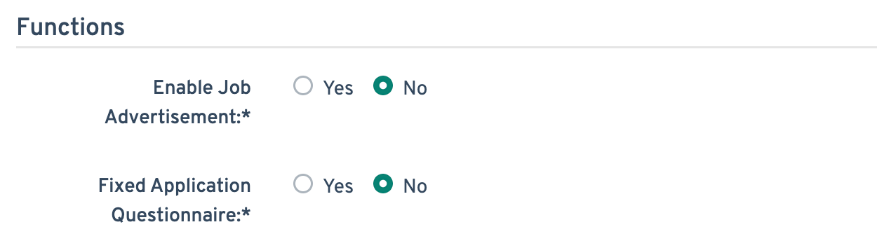 - Select No for Enable Job Advertisement and Fixed Application Questionnaire.