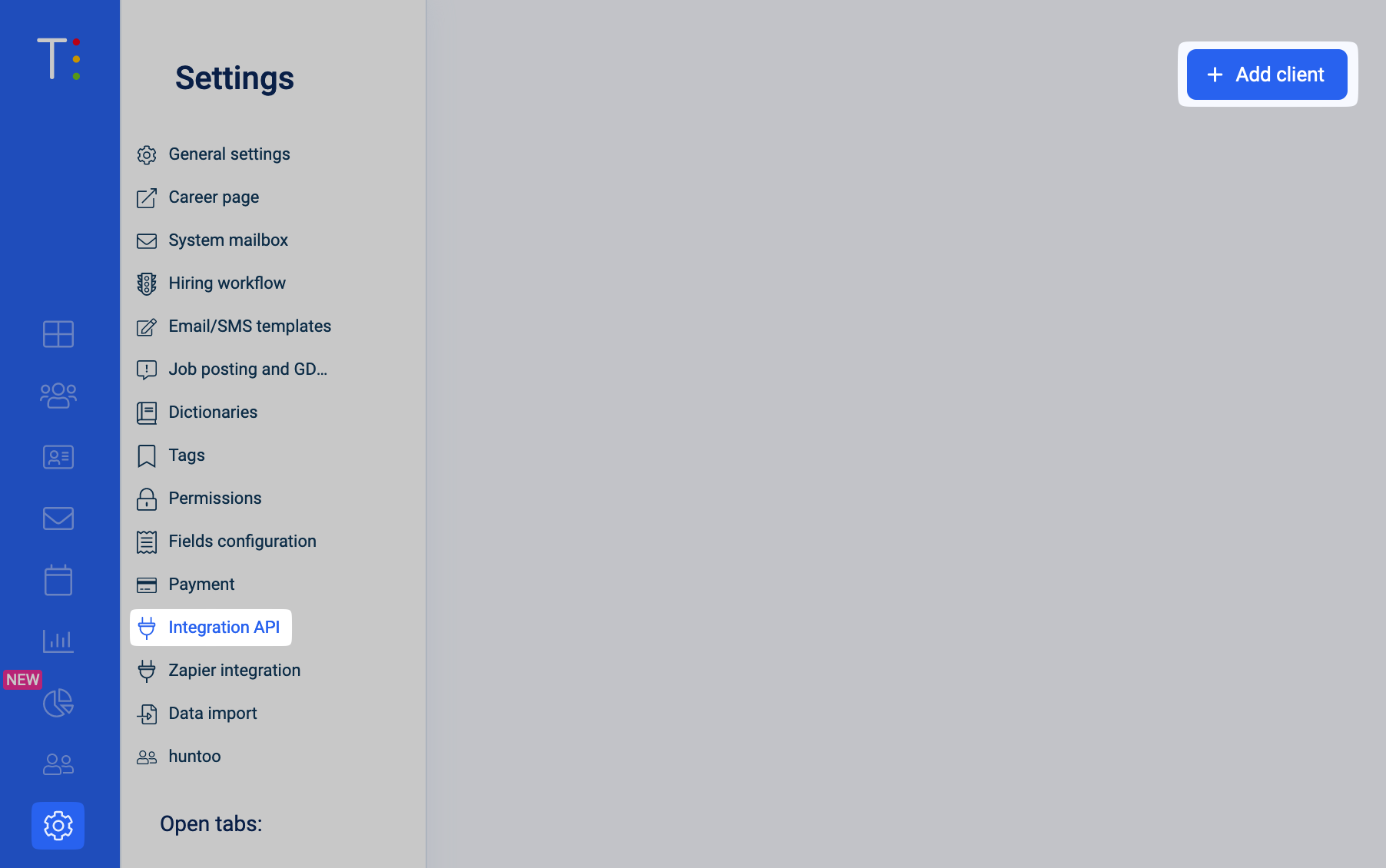 Log into TRAFFIT, then click on the cog in the bottom left, then on "Integration API", then "Add client":