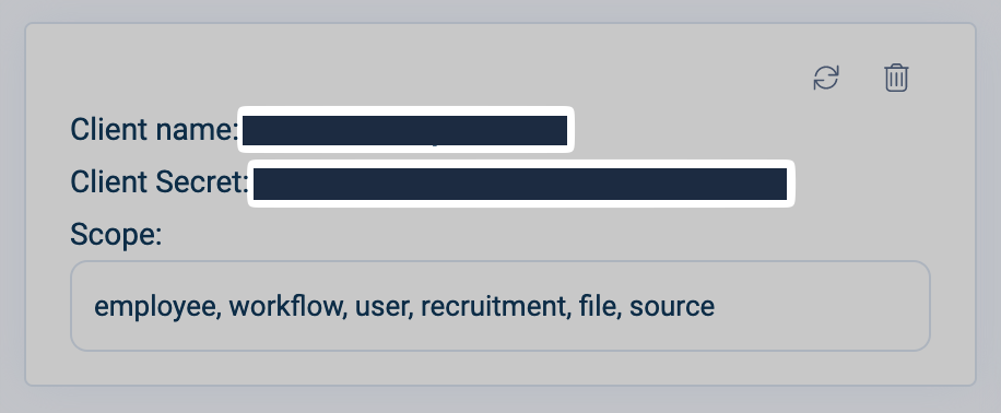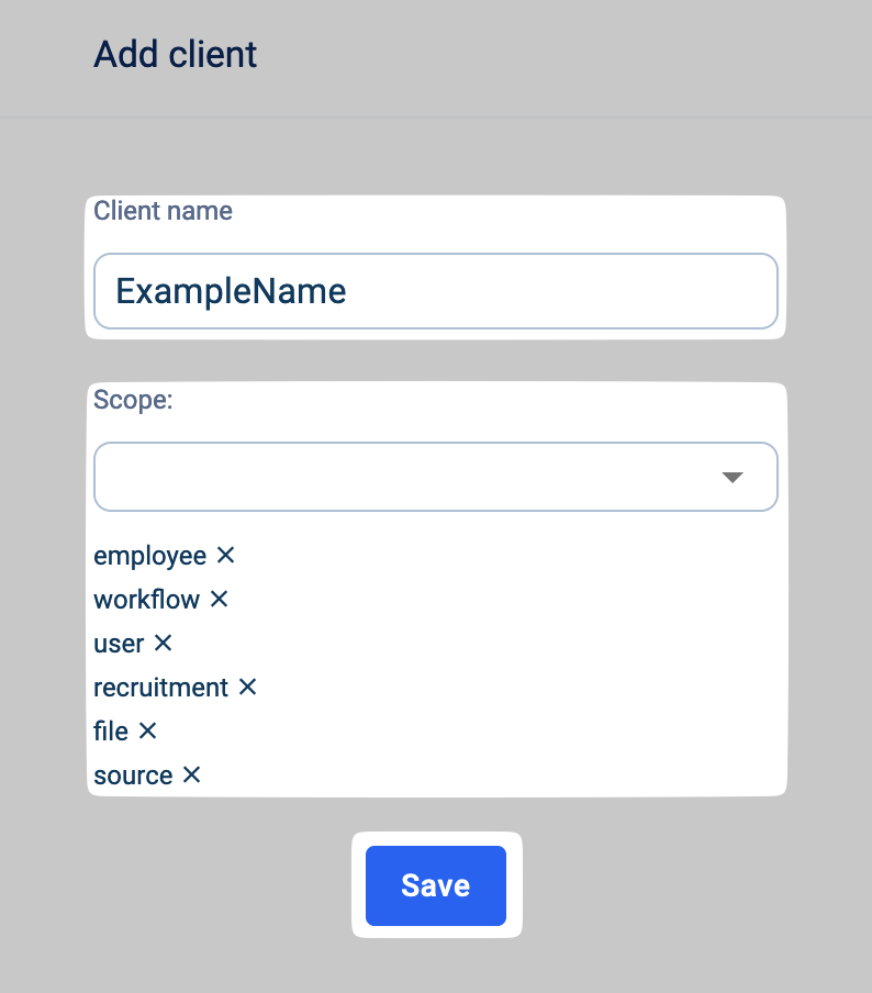 Enter a name under "Client name, select the required scopes: Note: Go back to the connection flow to view the specific scopes required for your integration: Note: These scopes are only an example, they might differ in your case.