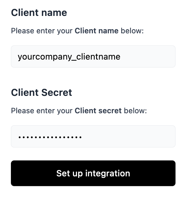 Copy the values of "Client name" and "Client secret" back into the connection flow then press "Setup Integration":