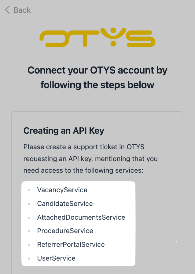 To gain access to an API key, you need to create a support ticket within your OTYS system. In OTYS, creating a support ticket is a charged service:
