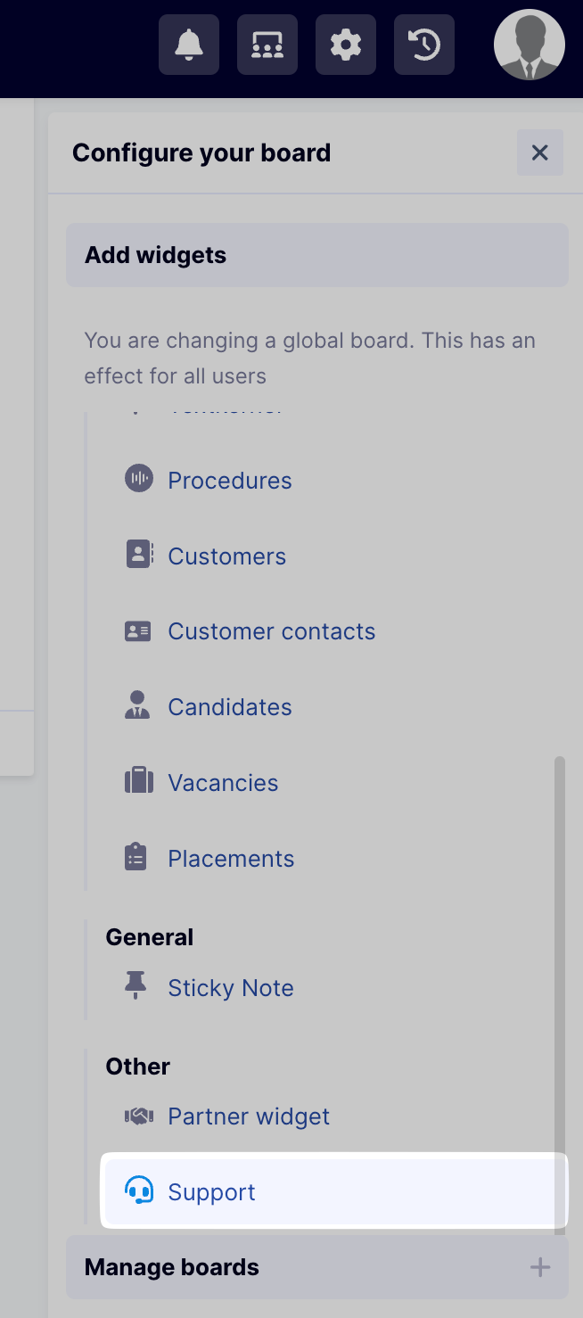 - Scroll down to the Other section and click on Support. This will add a support widget to the bottom of your dashboard. (You may have to scroll for it to come into view)