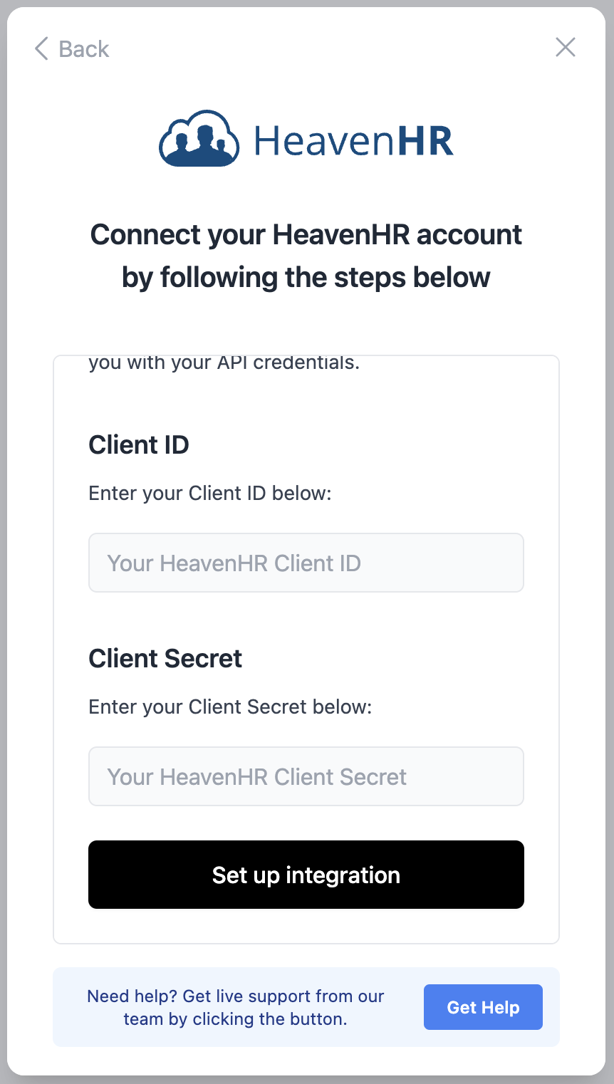 The setup is straightforward as soon as you have received the client ID and client secret from HeavenHR. Simply paste the credentials when prompted and click "Set up integration":