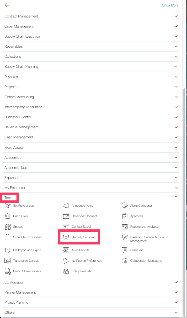 - Next, scroll down to "Tools" open the menu, then go to "Security Console":