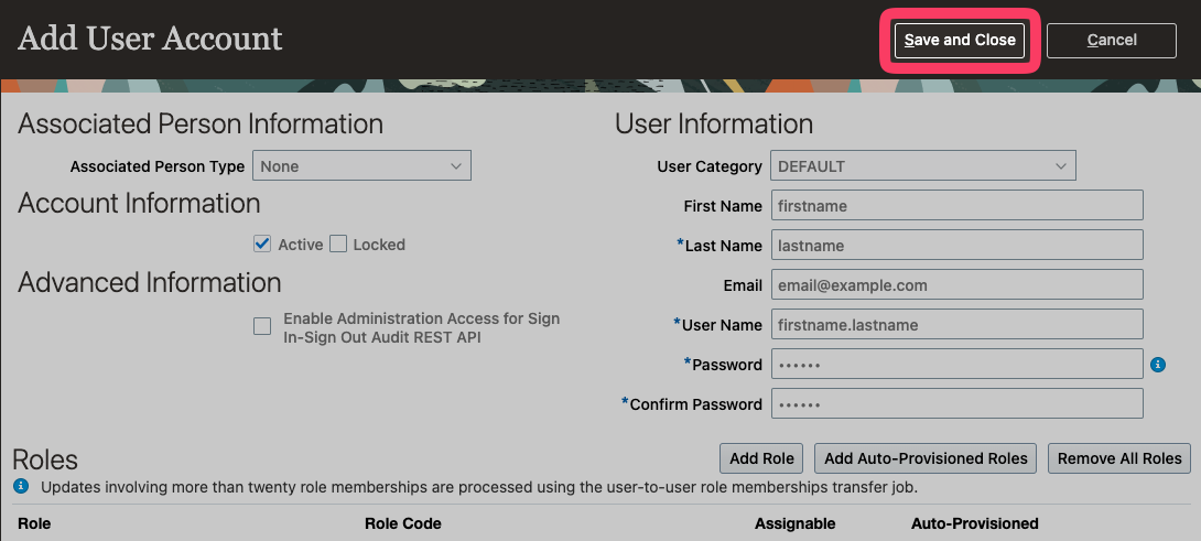 Note: This will look different in each case, please add the roles found in the connection flow: - Finally, once you have added all the required roles to the user, press "Save and Close".