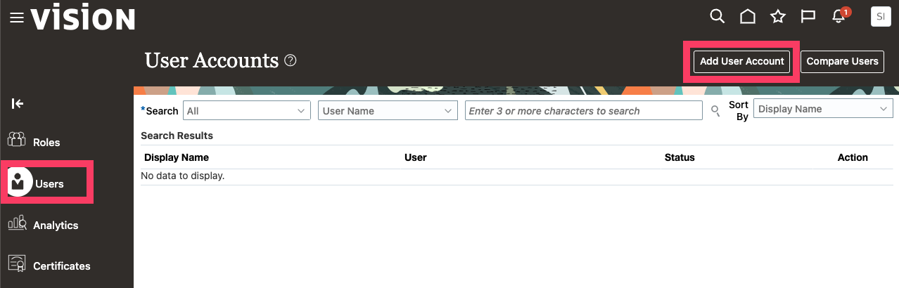 Note: If you don't see the "Security Console" setting, you don't have the right permissions to complete the connection. - Next, go to "Users" then "Add User Account"