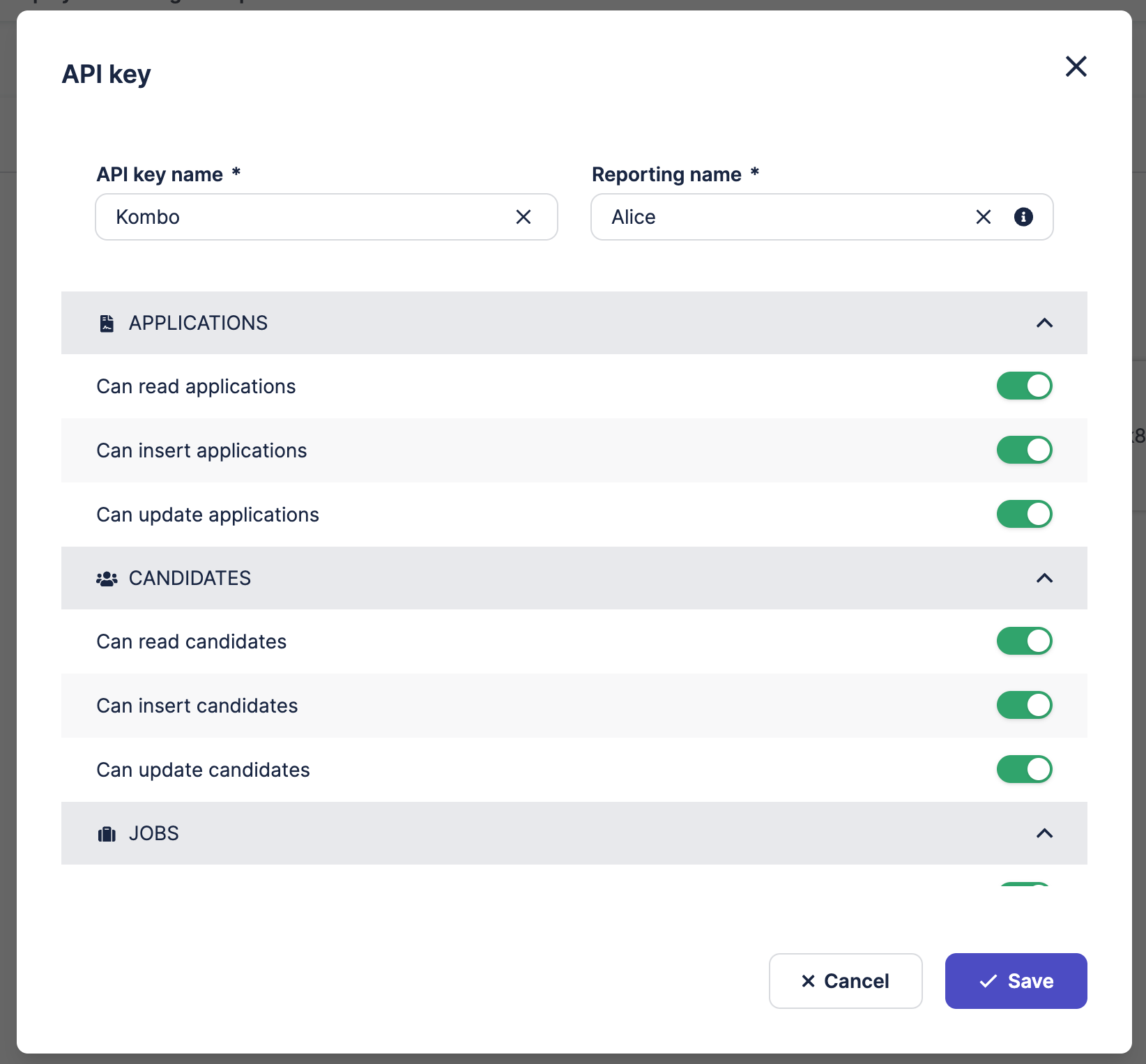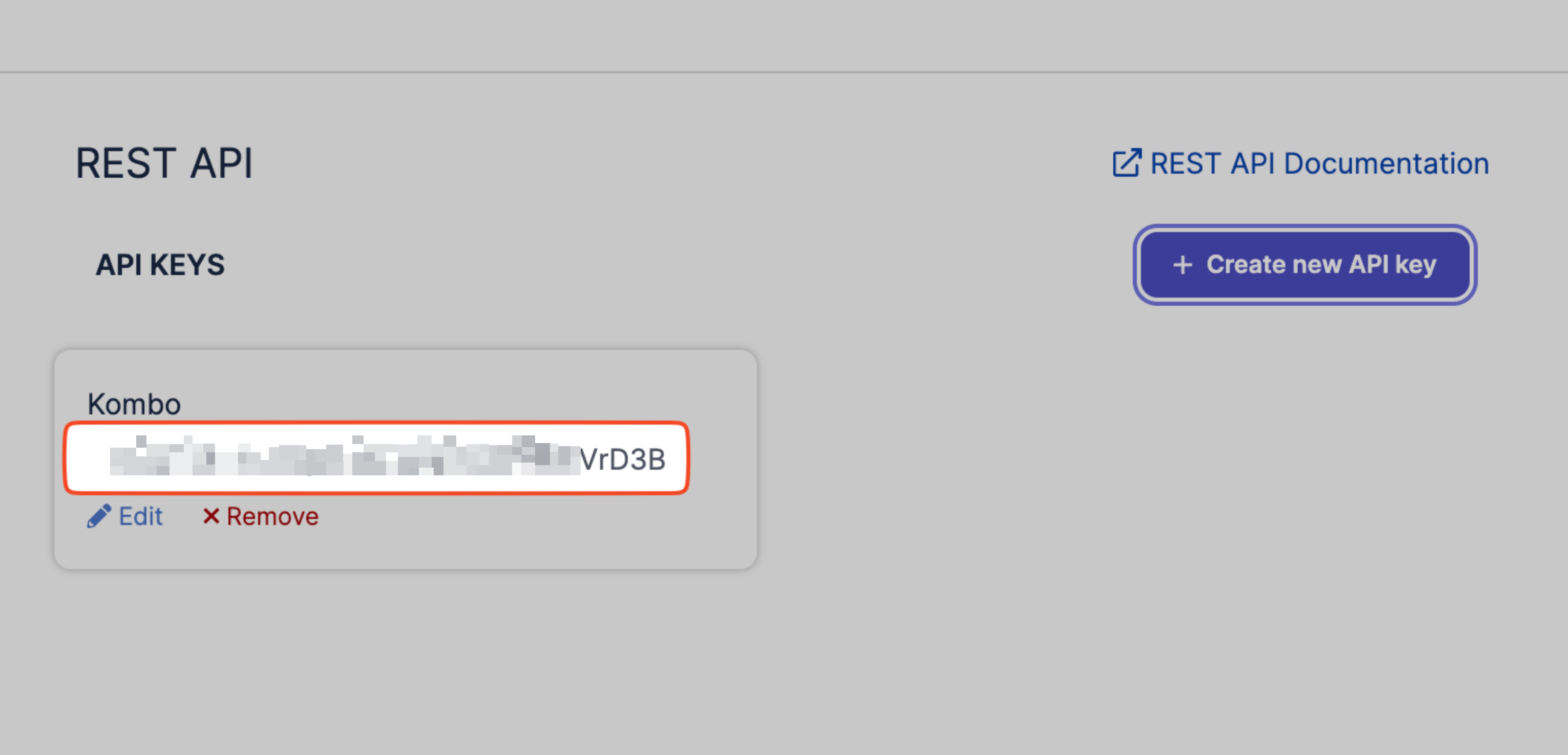 5. Your new API Key will appear under the name you specified. You can copy this code and paste it into the new integration dialog in Kombo.