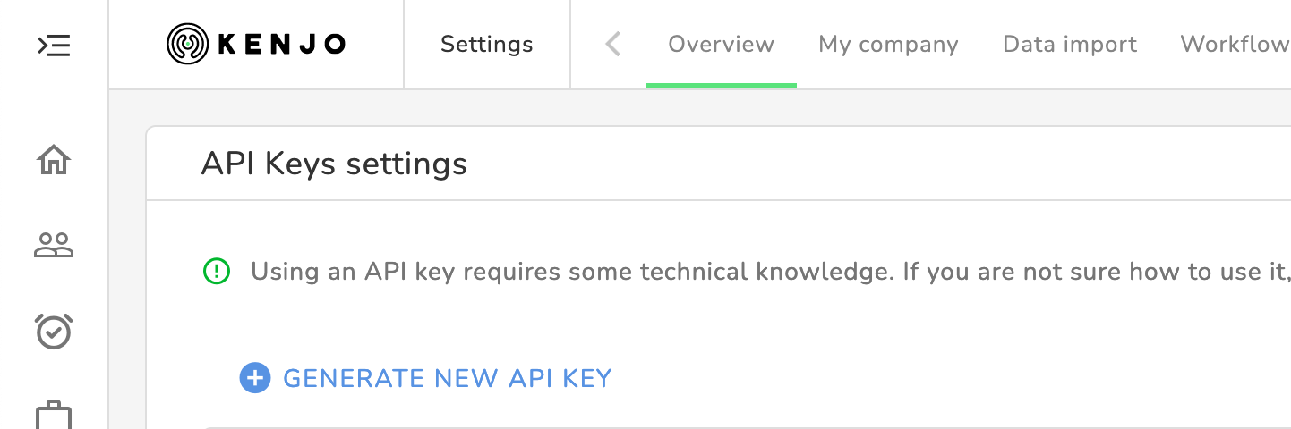 - Log in to Kenjo, then, navigate to the API Keys settings page, which can be found here: