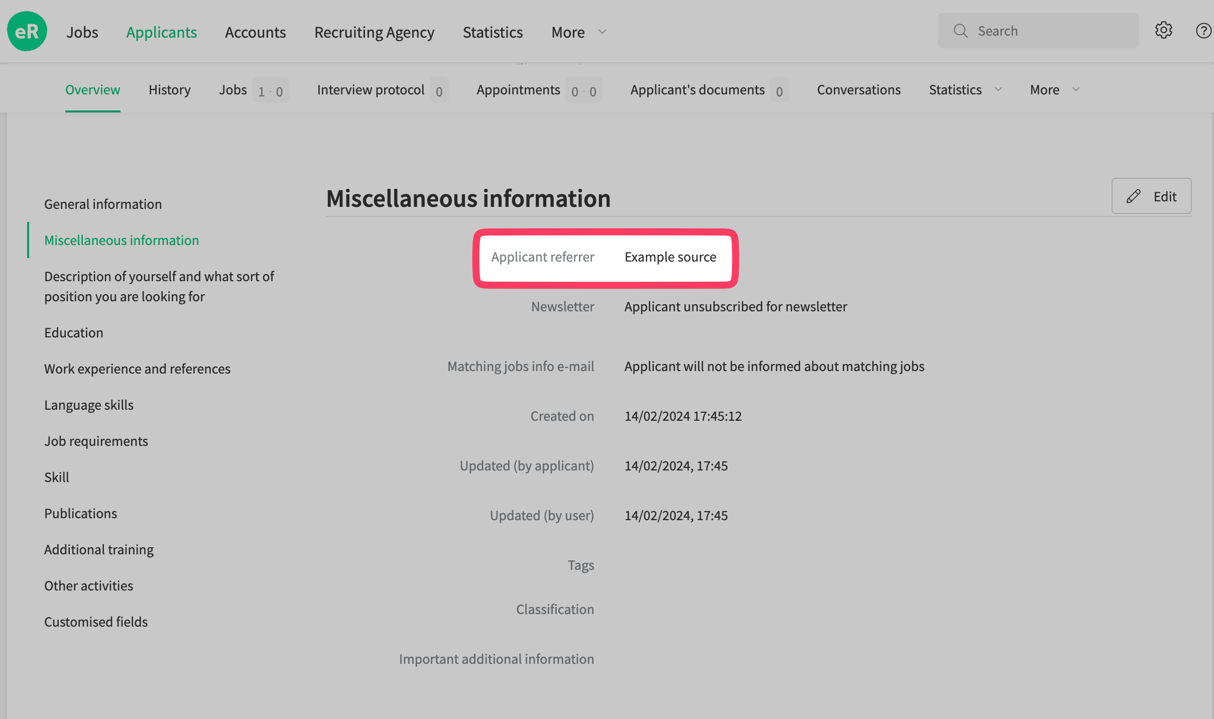 The source is listed as "Applicant referrer" under the "Miscellaneous information" of an applicant