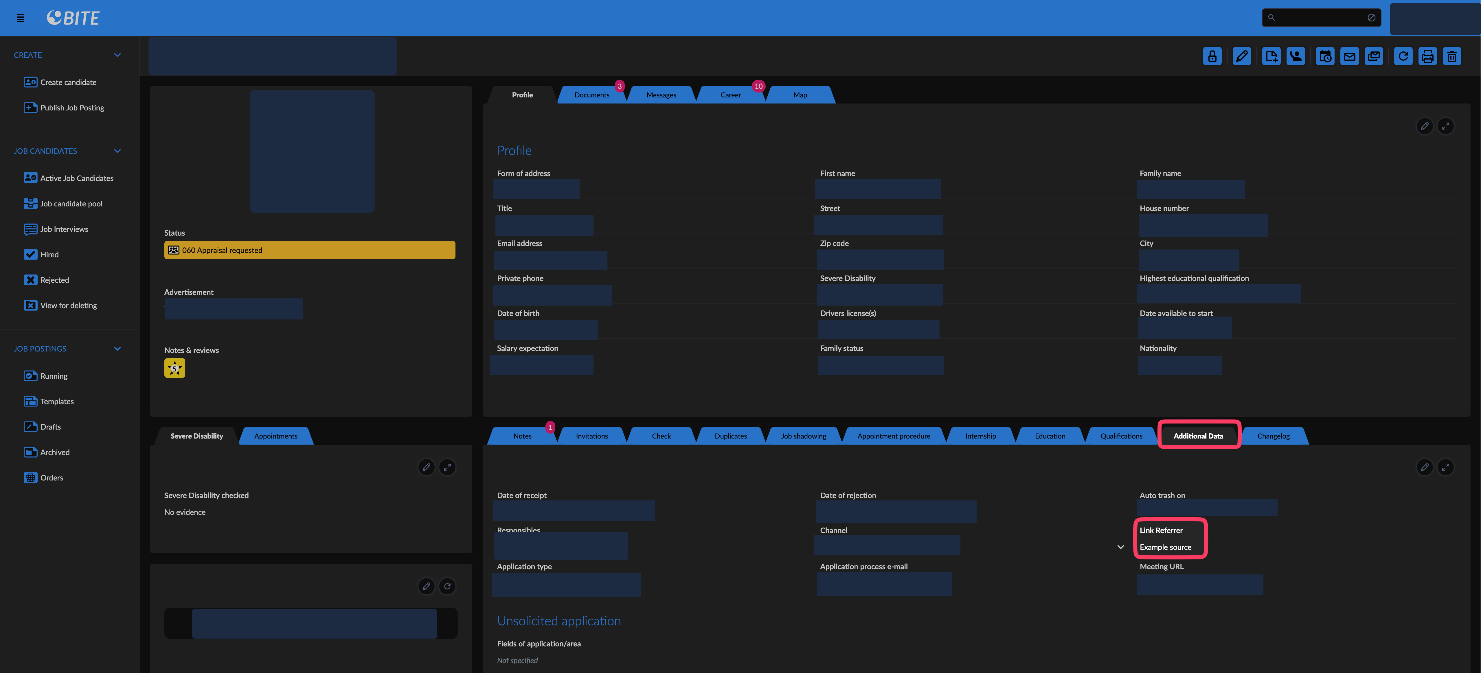 Bite: How to view a candidates source February 16, 2024 14:13 Updated View source: You can view the source of a candidate by clicking on "Additional Data", then it will be listed as "Link Referrer"