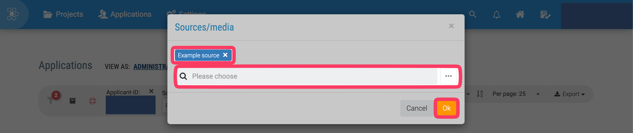 Search and select all sources you want to filter by and click "Ok"