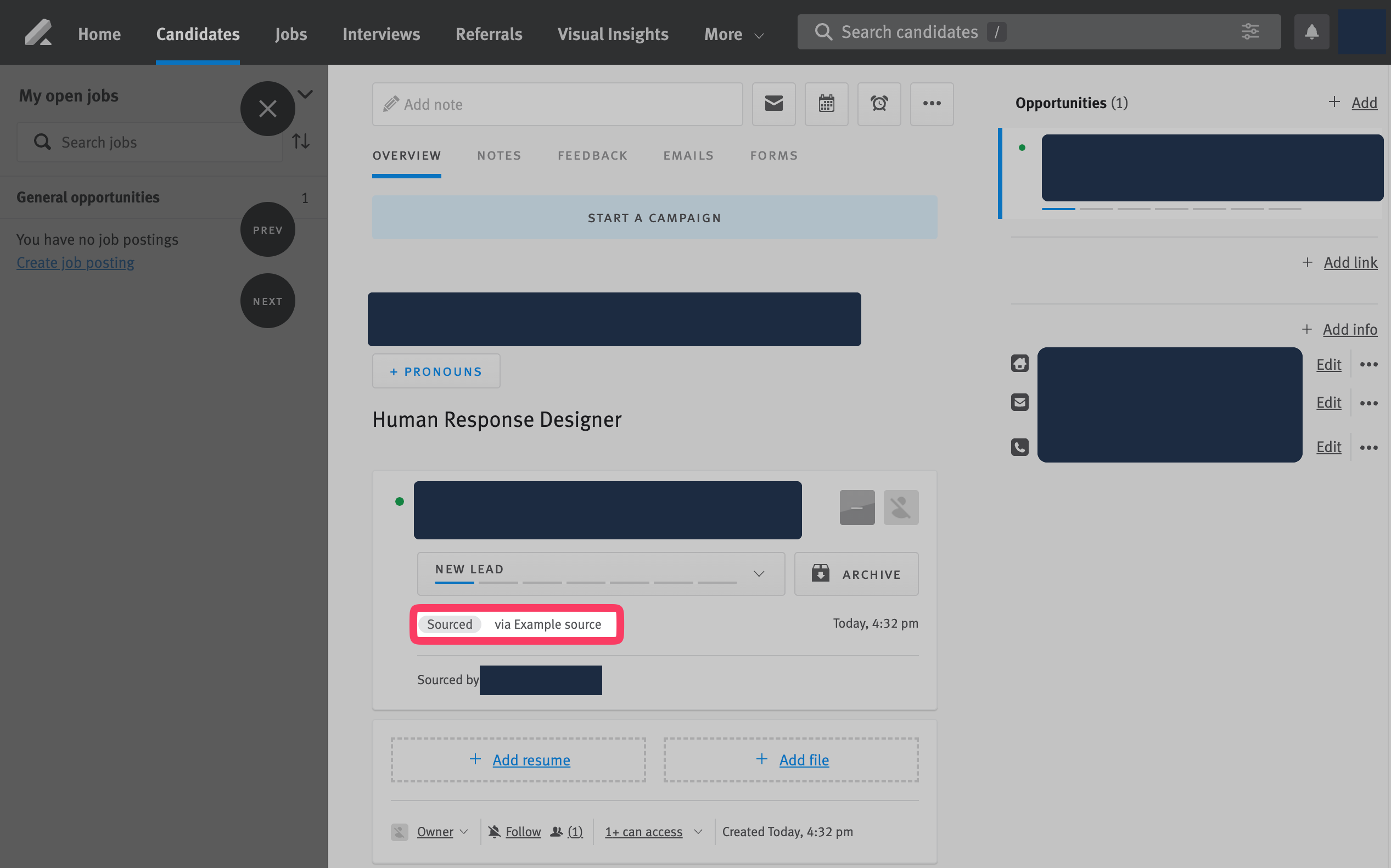 The source is displayed as "Sourced via" underneath the application on each candidate's profile