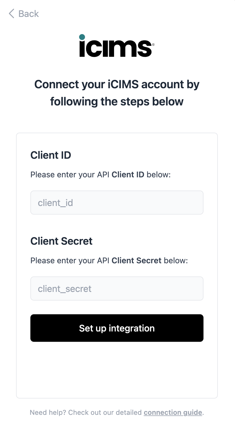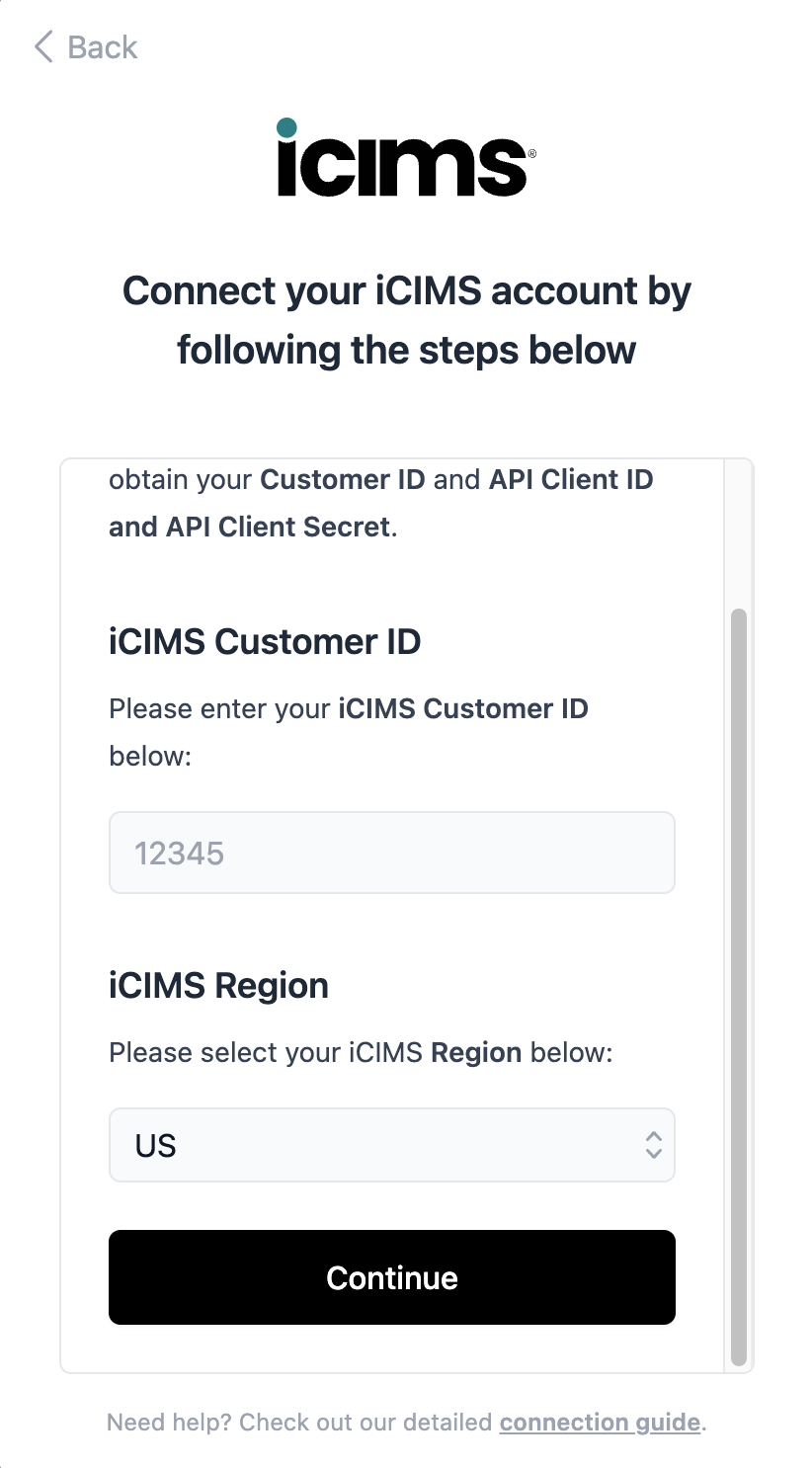 After those steps are completed, iCIMS will provide you with the following necessary credentials that you need to enter next in the connection flow:
