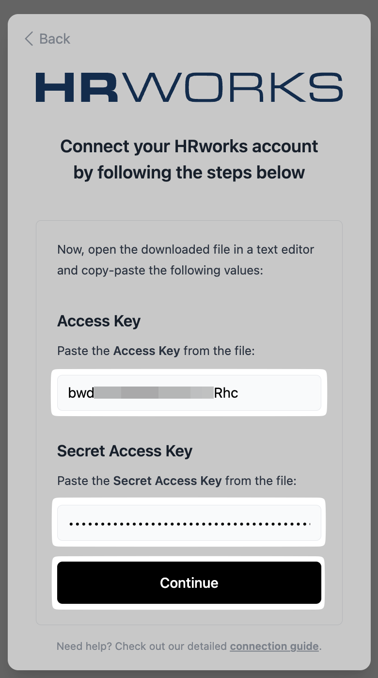 Secret Access Key: XNN73f3/P.......................U9DoOnB6 - Enter the credentials into the connection flow, and press continue