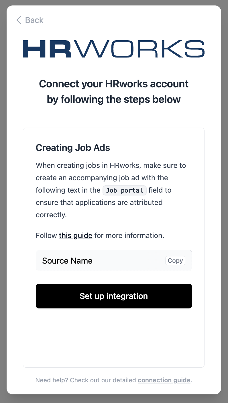 This is just an example, your required scopes might look different! - In the case that source attribution is desired, a final screen will appear describing how to set up jobs in HRworks