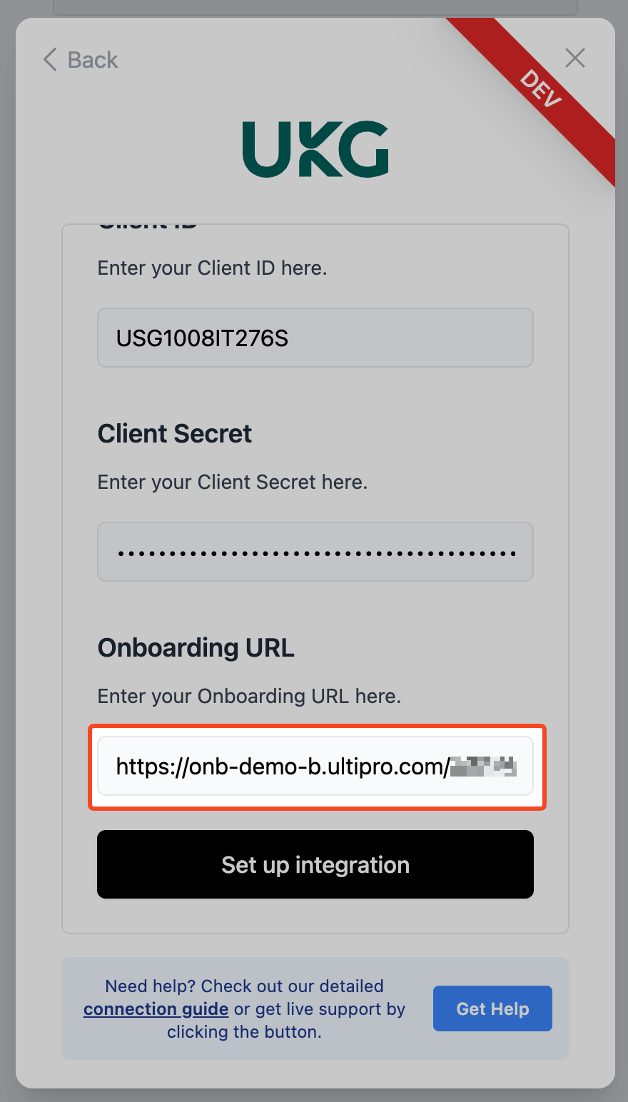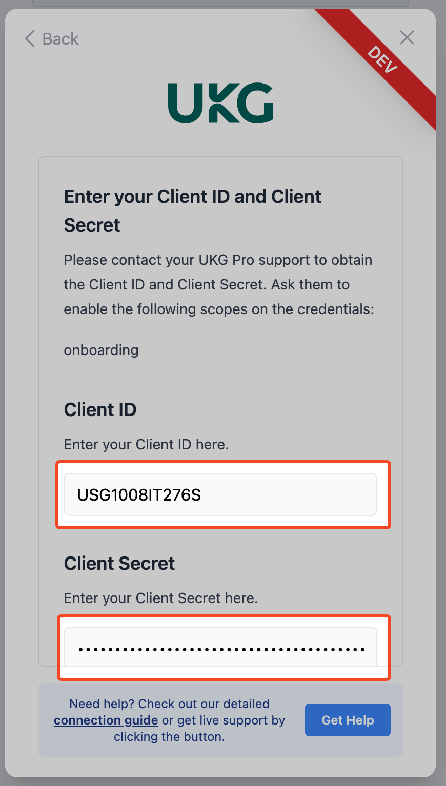 If you want to create an employee in UKG Pro onboarding, please contact your UKG Pro support to obtain the Client ID and Client Secret. Ask them to enable the onboarding scopes on the credentials.