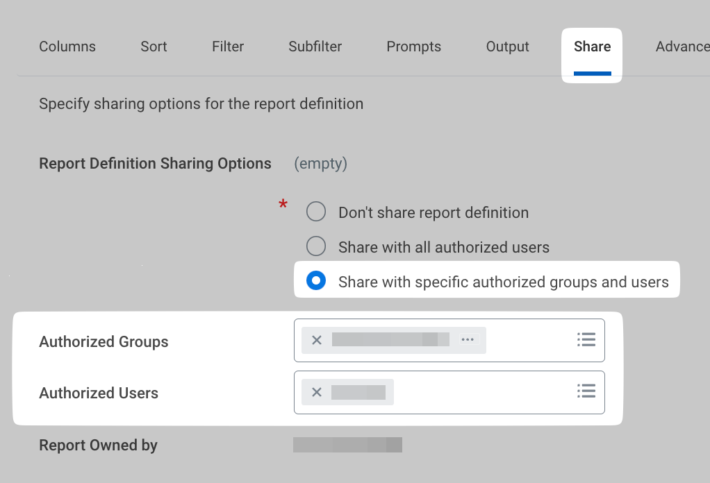 - In the Share tab, set the Report Definition Sharing Options to Share with specific authorized groups and users, and select the ISU and group that you used to create the integration.