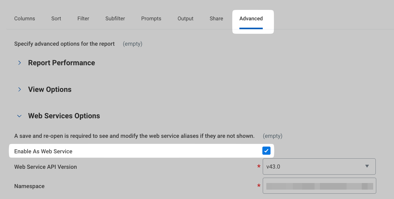 - Enable As Web Service: Checked (This checkbox will only appear after setting the report type)