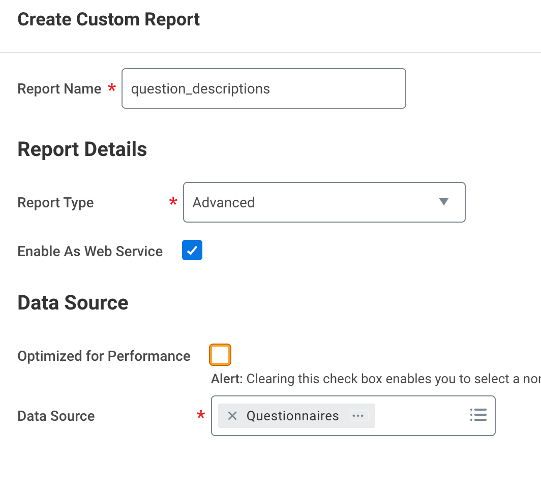 - Data Source: Questionnaires (This option will only be available if you have Optimized for Performance unchecked)
