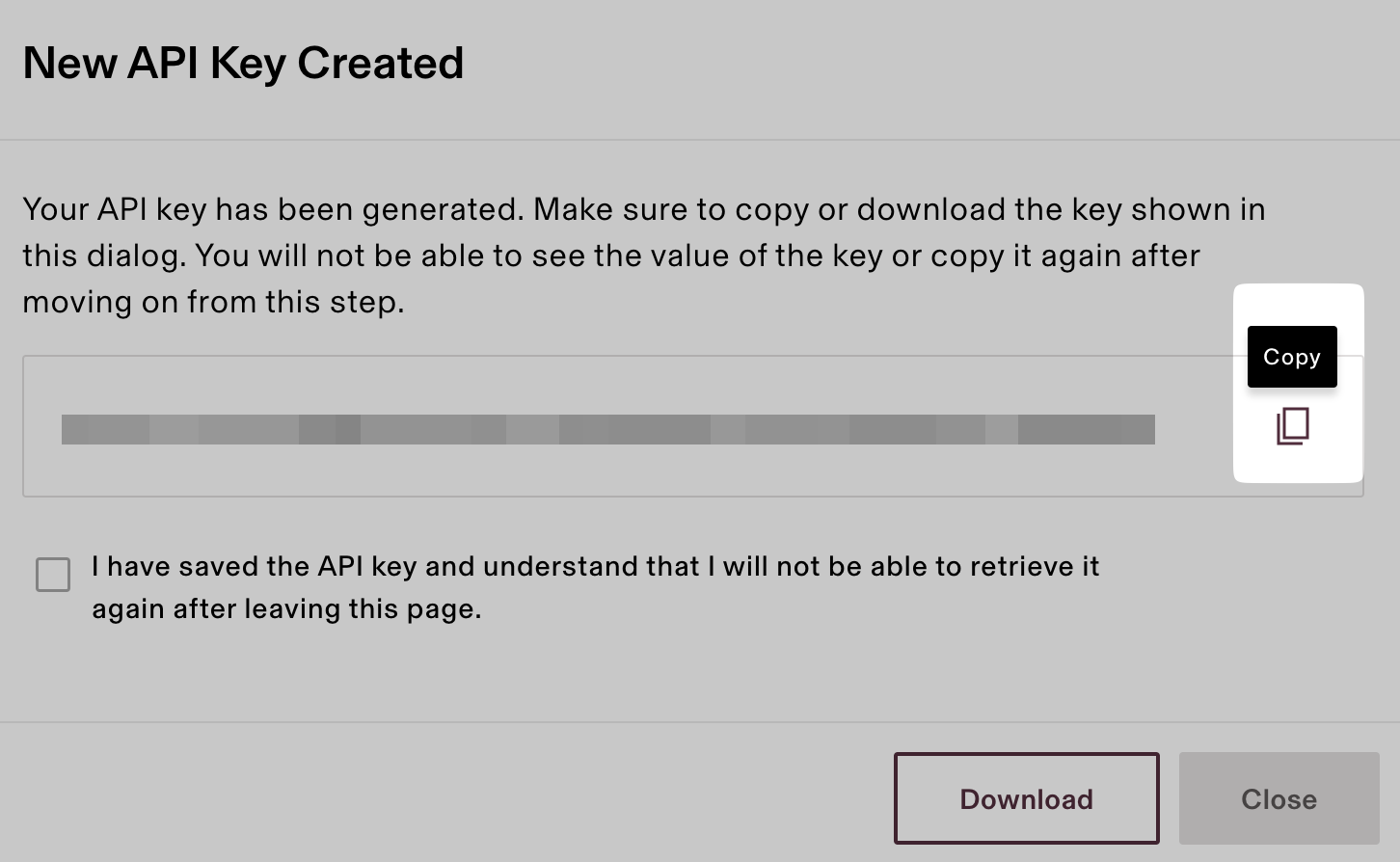 Note: the above screenshot is just an example of possible permissions. Only select the permissions that are displayed in your connection flow. - Copy the created API key by clicking on the icon, and copy it into the connection flow