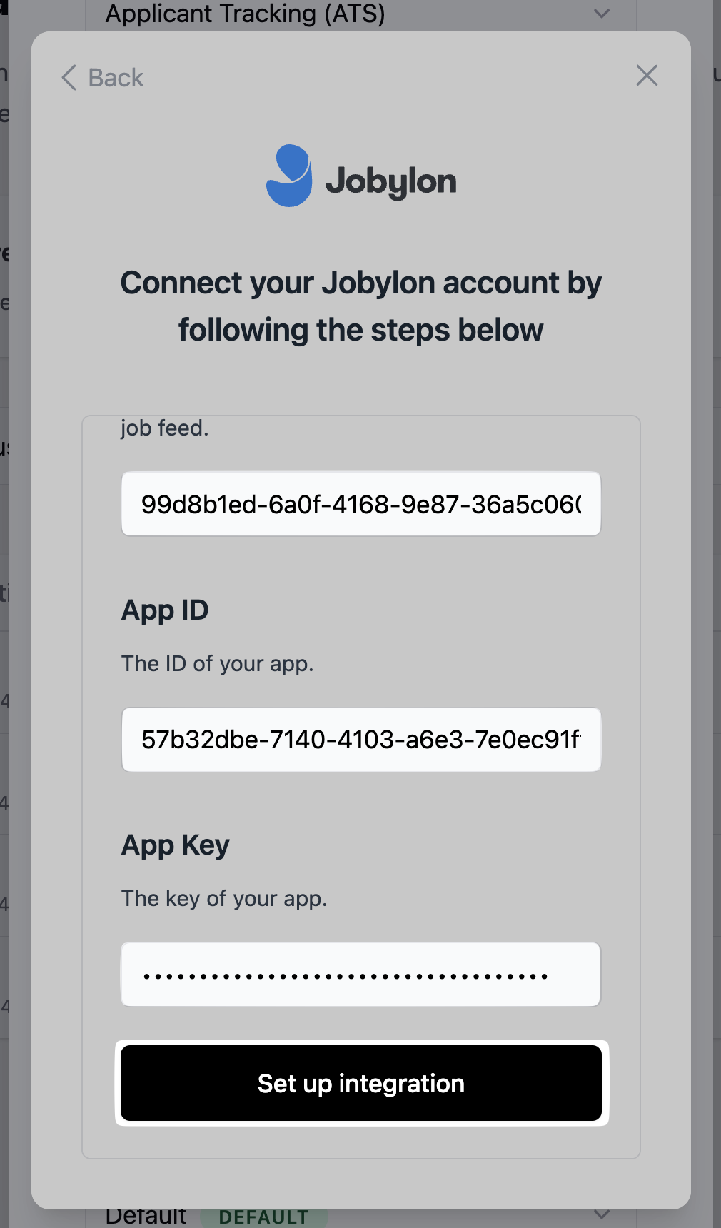 Once you have received your credentials from Jobylon support, enter them into the connection flow and click "Set up integration"