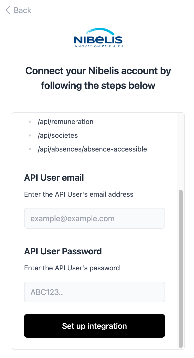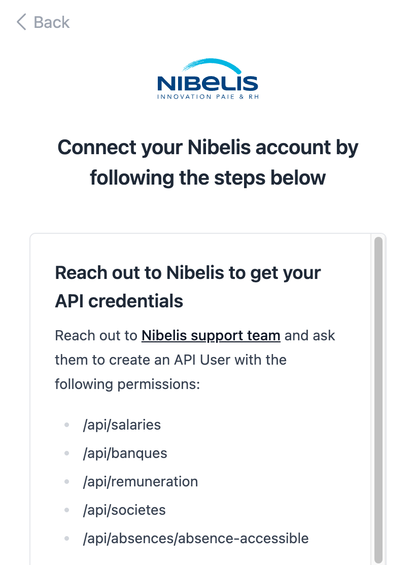 - Reach out to the Nibelis support team and ask them to create an API User with the permissions shown in the connection flow: