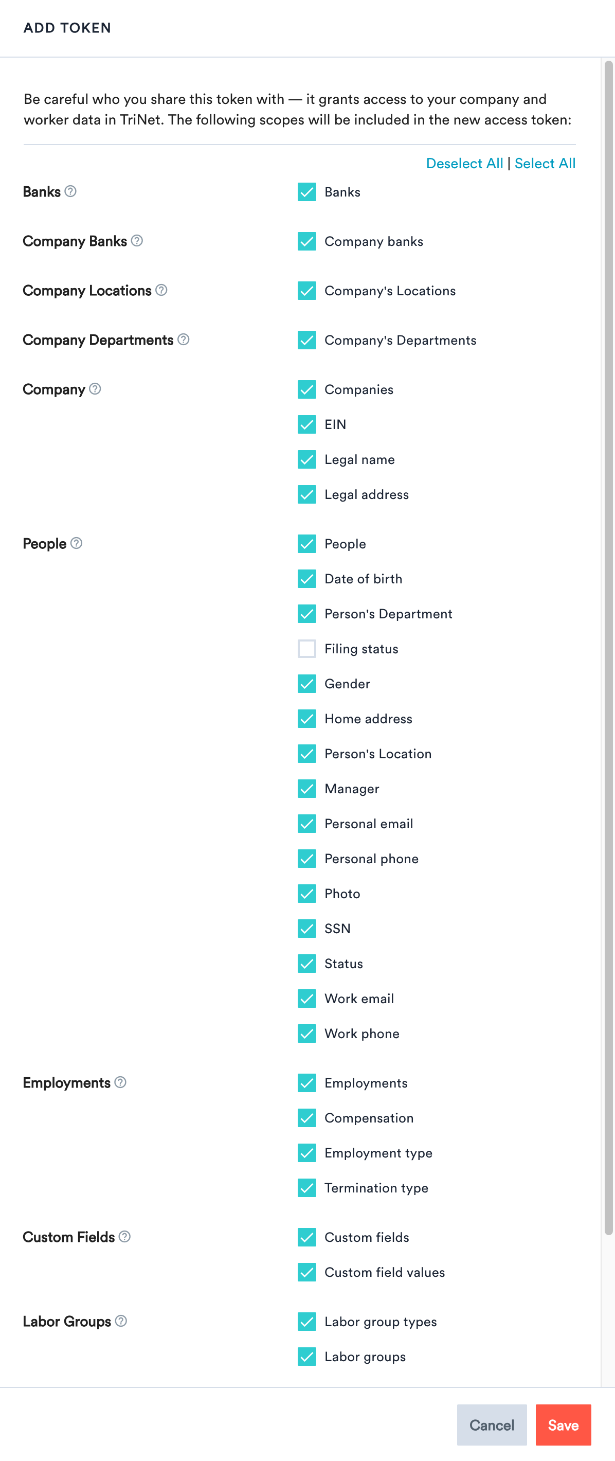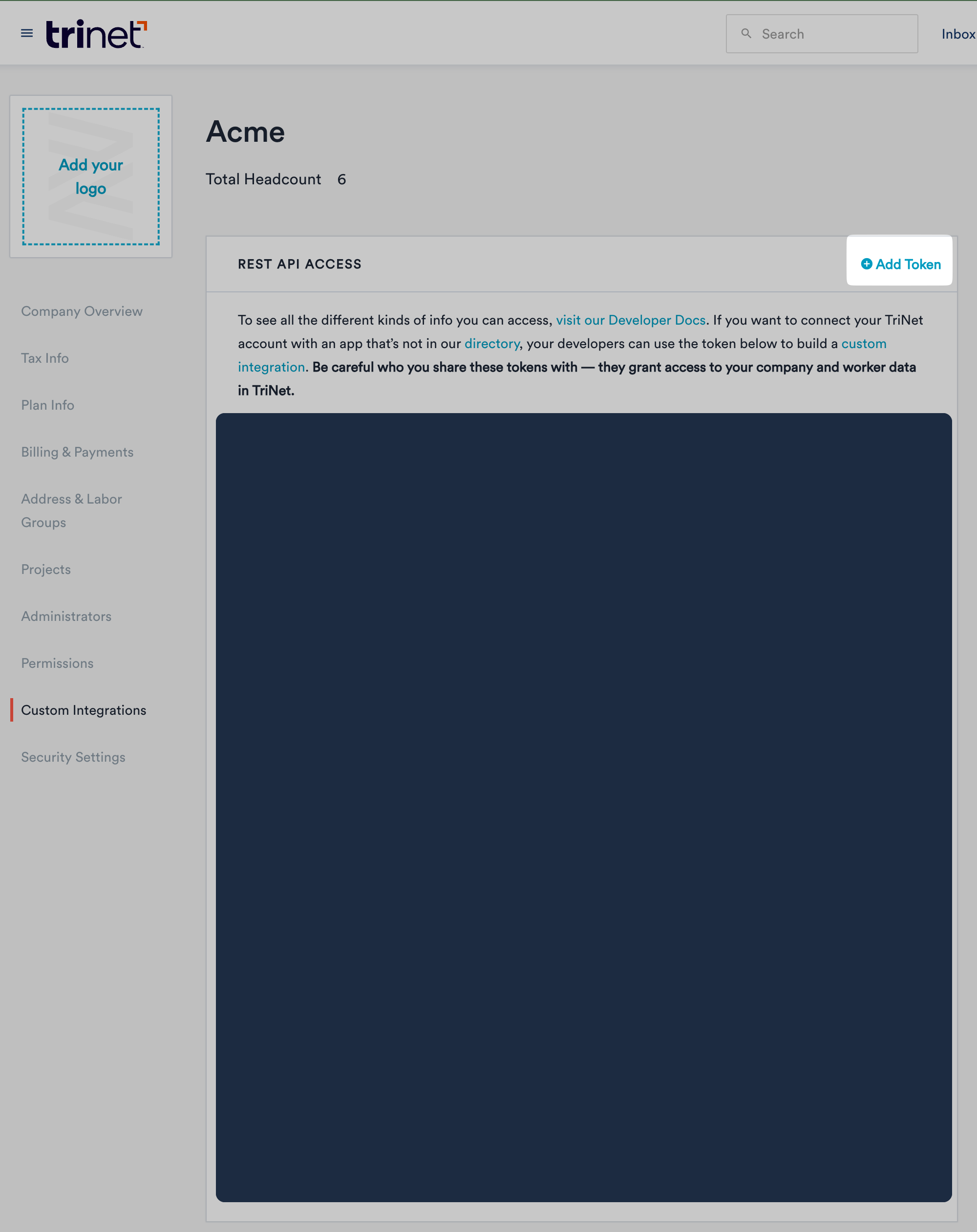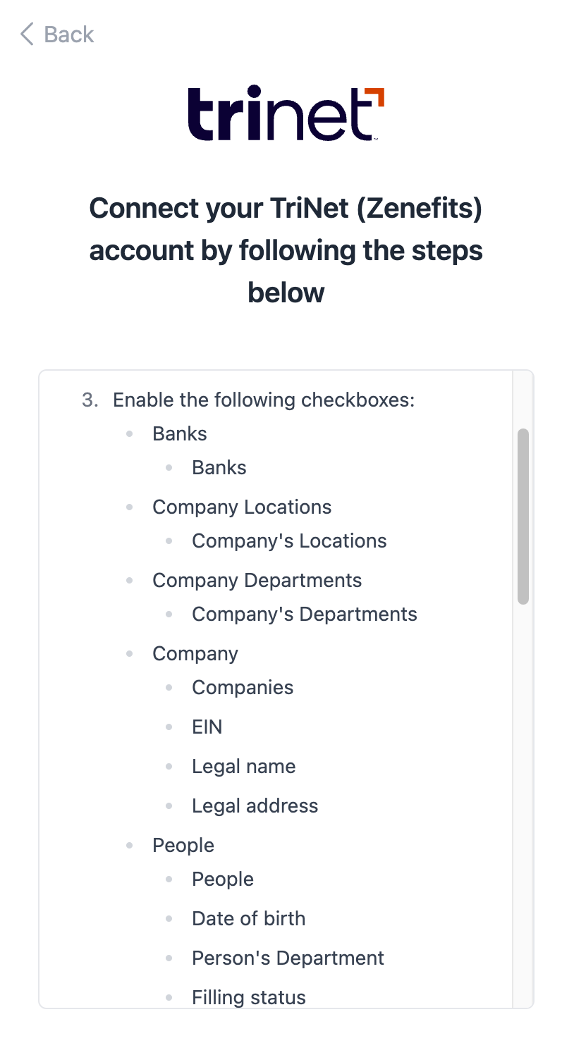 - Open the custom integrations page in TriNet (Zenefits).