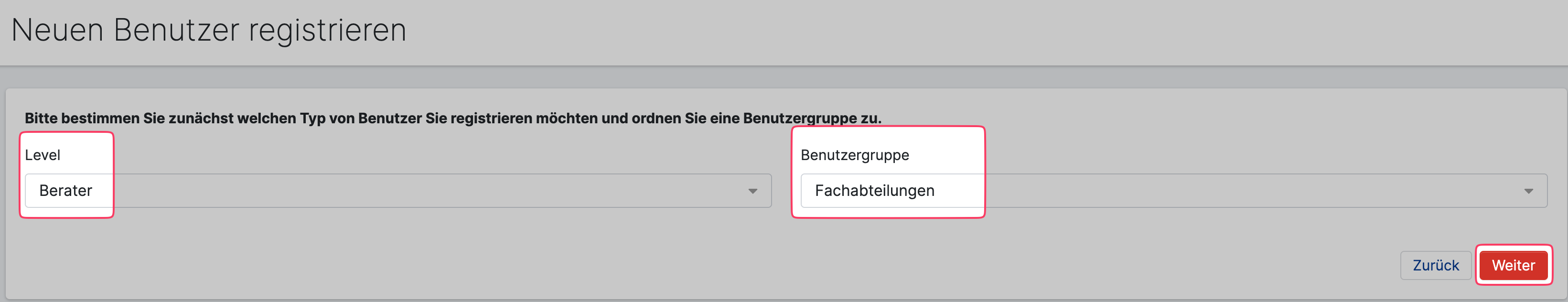 - Geben Sie dem neuen Benutzer das Level "Berater" und eine passende Benutzergruppe.