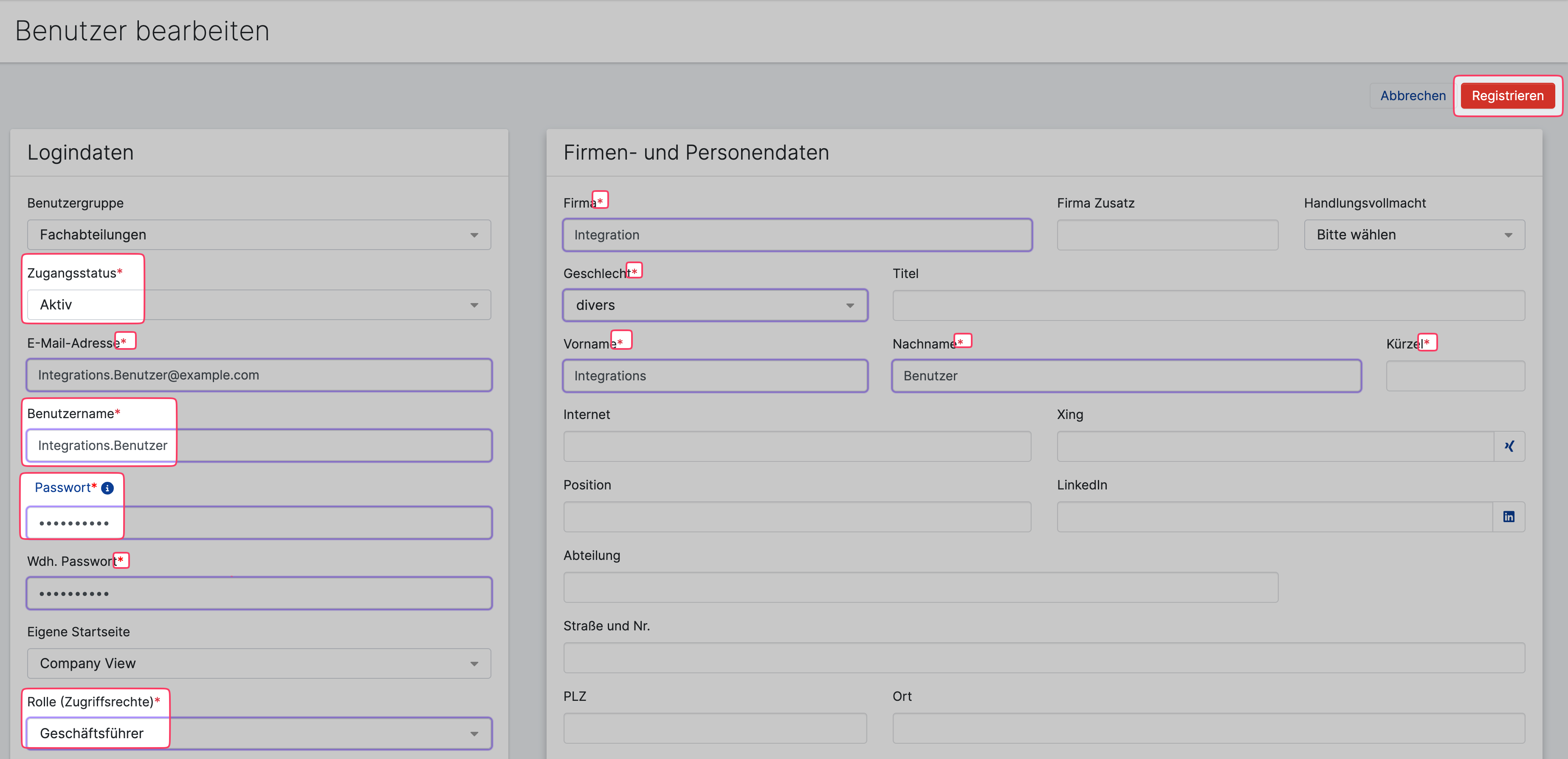 - Achten Sie dabei darauf den Zugangstatus auf Aktiv zu setzen und als Rolle (Zugriffsrechte) Geschäftsführer zu wählen.