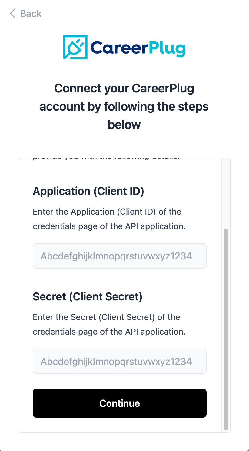- Copy the Application and Secret values into the connection flow as shown below, and click on Continue in the connection flow
