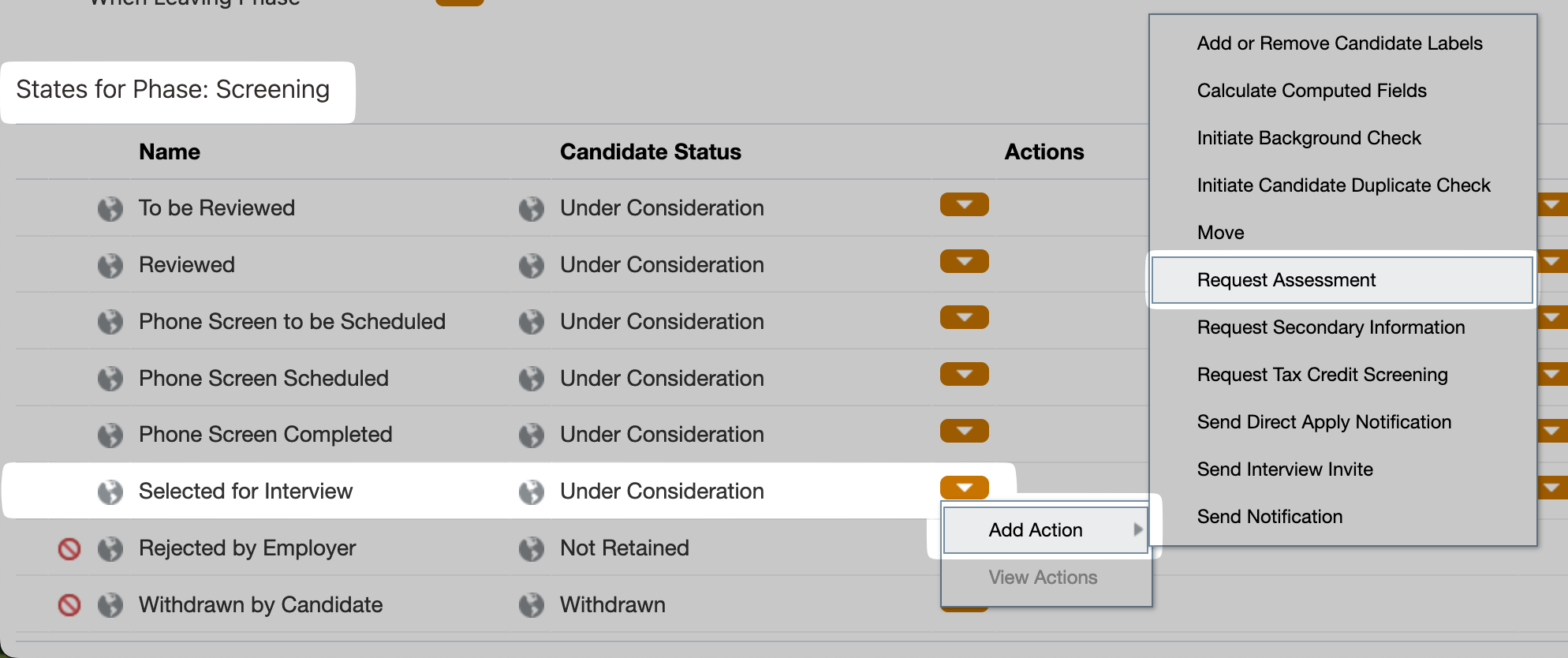 - Under "States for Phase", go to the state that you would like the assessment to be triggered for, then, under "Actions", select "Add Action", then "Request Assessment":